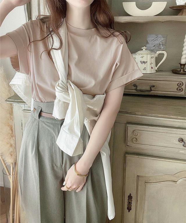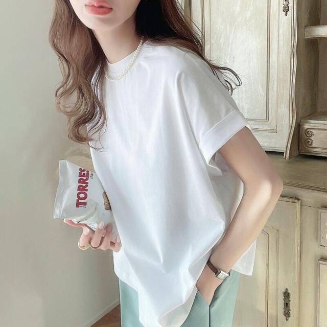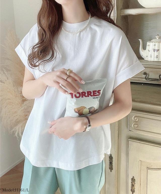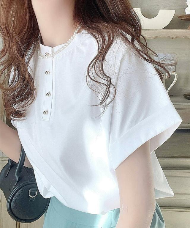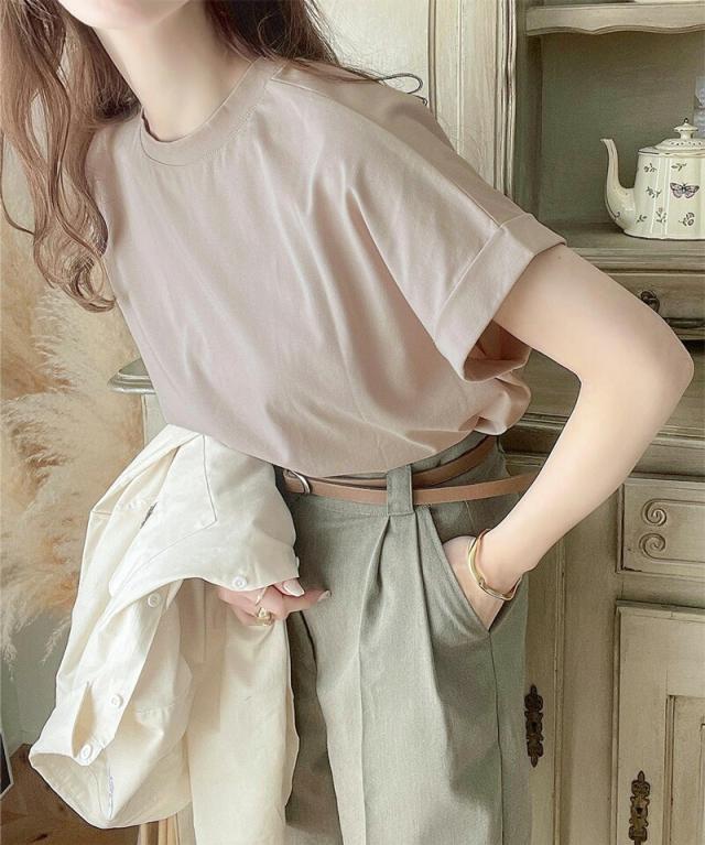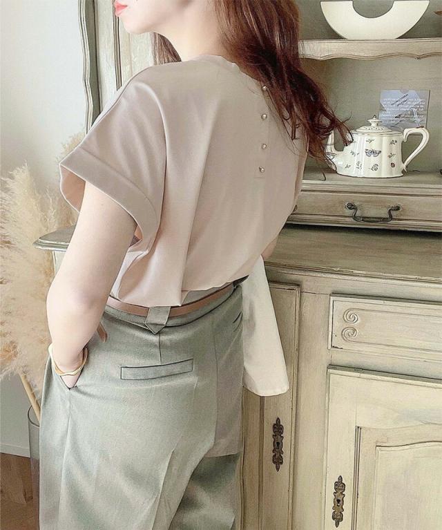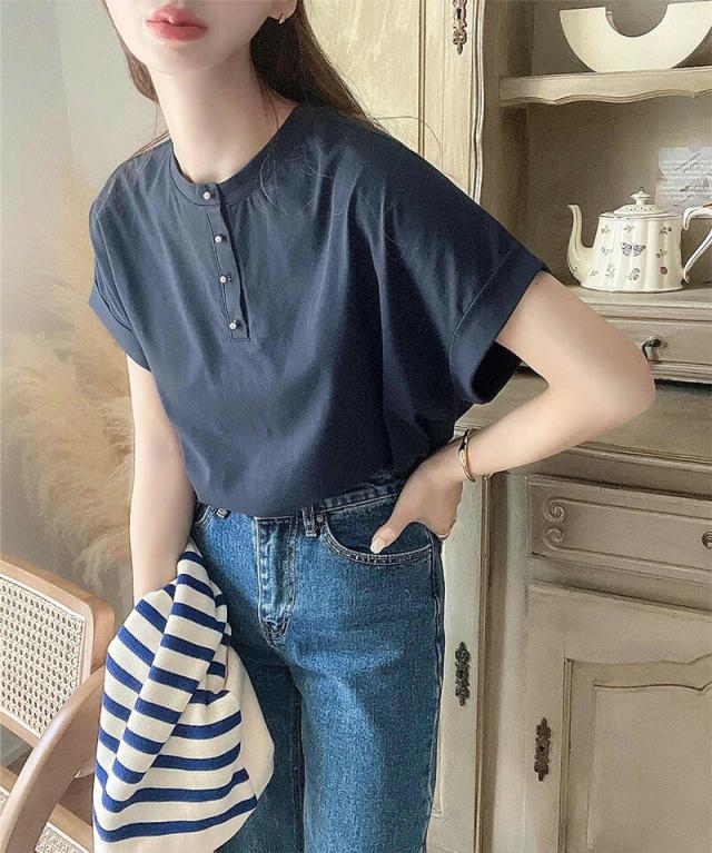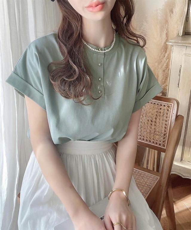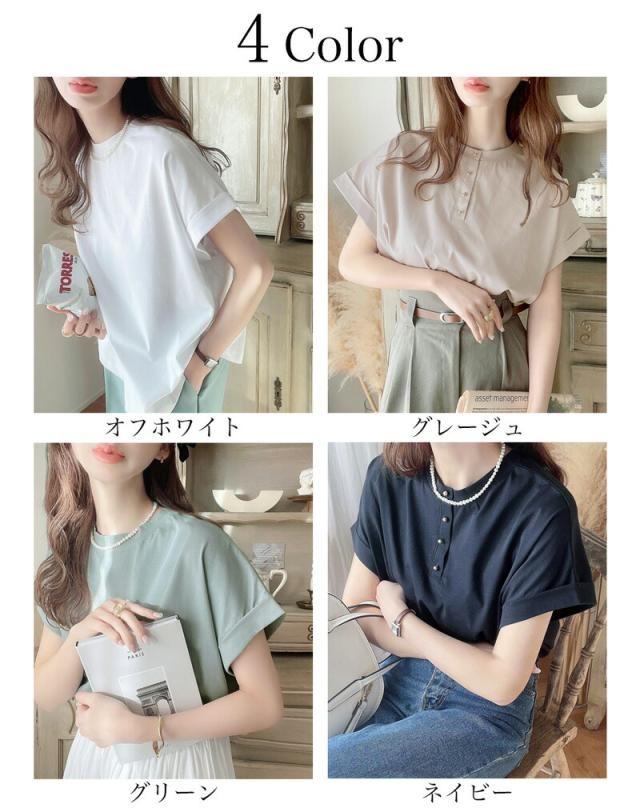 冬新作 クラシカルエルフ トップス tシャツ レディース カットソー 前後2way シルケット メタルボタン フレンチスリーブ シンプル 華奢見え 体型カバー 無地 クルーネック オフィス カジュアル オーバーサイズ ゆったり 半袖 大きいサイズ 2023ss ce1020091