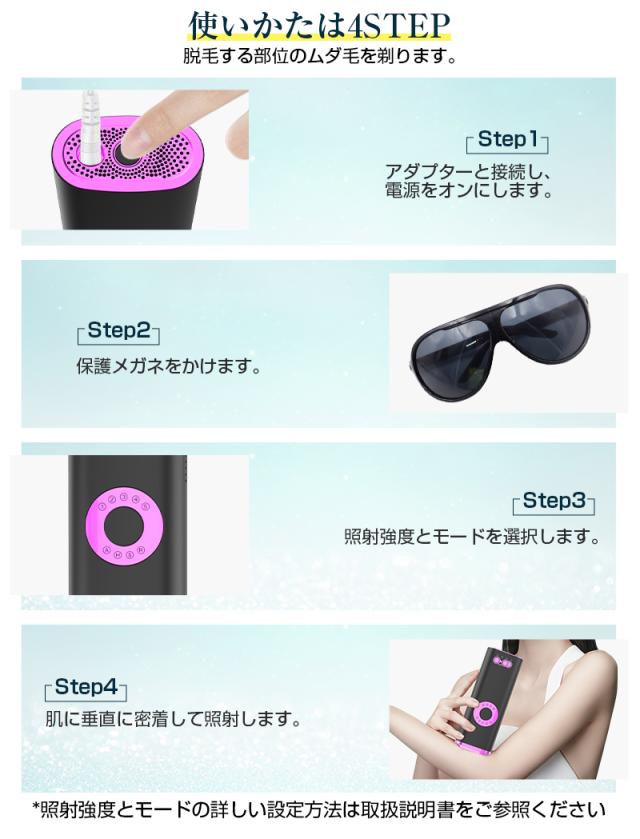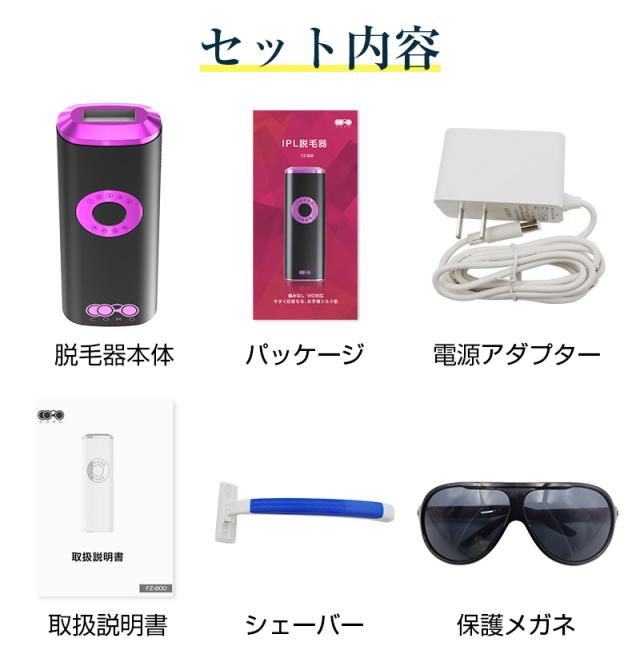 【パッケージ内容】脱毛器、電源アダプター、保護メガネ、シェーバー、日本語取扱説明書