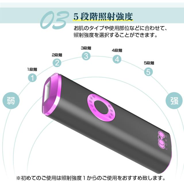 【5段階照射レベル&2つの照射モード】使用部位や肌質に合わせて、照射レベルが5階段に調節でき、ムダ毛ケアの効率がアップ!また、手動と自動の2つの照射モードを切り替えることができます。手動照射モードは小範囲の脱毛に適し、自動照射モードは広範囲の脱毛に適します。