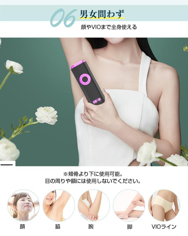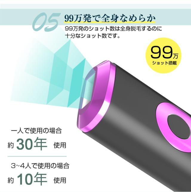 【99万回照射・全身対応・男女兼用】99万回照射可能、ショット単価がとても安くて、全身脱毛を完了しても、まだまだ使えるコスパ最高なタイプです。家族やパートナーとシェアしやすい点がうれしいポイント。
