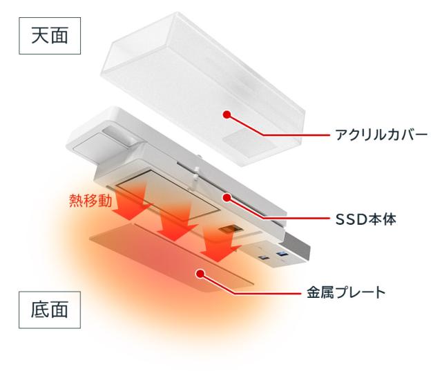 高温になりがちなSSD本体の熱を金属プレートに拡散することで性能低下を抑えます。さらにアクリルカバーで本体を覆うことにより、手で触れる場所(天面/側面)の発熱を抑える「熱分離構造」を採用しています。