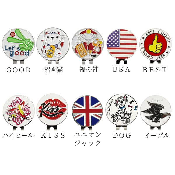 ゴルフ ボール ハットクリップ 印 プレイ 便利 マグネット 目印 ピン マーカー ゴルフ用品 景品 お洒落 ボールマーカー ユニオンジャック KISS 招き猫 福の神 国旗 USA ハイヒール