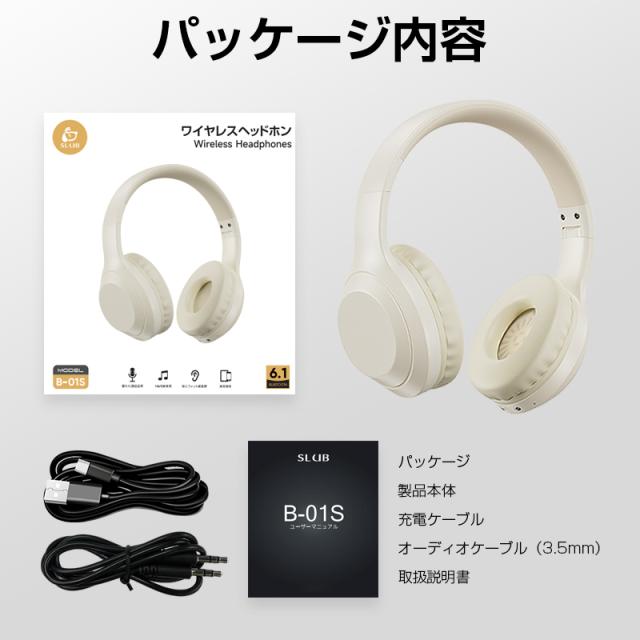 【パッケージリスト】ワイヤレスヘッドホン本体、充電ケーブル、3.5mmオーディオケーブル、日本語取扱説明書。