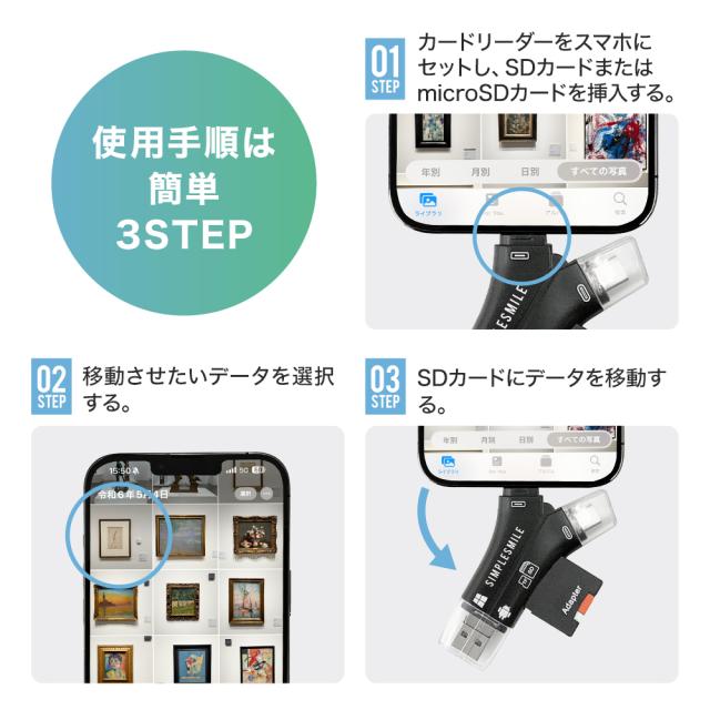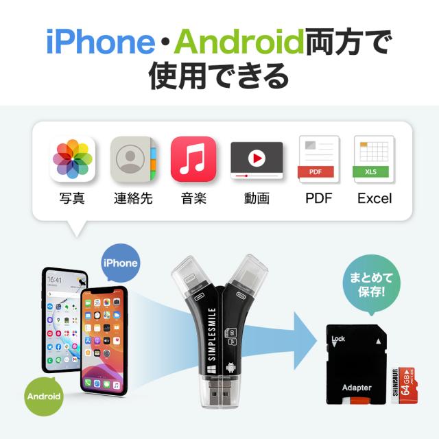 スマホに溜まった写真の整理に! SDカードリーダー iPhone カードリーダー バックアップ USB USBメモリ 写真 データ スマホ マイクロSDカードリーダー
