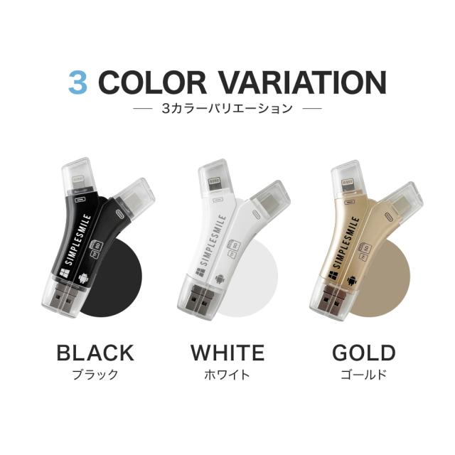 | 商品仕様 | ■カラー:全3色 ・ホワイト ・ブラック ・ゴールド ■接続端子(転送速度) ・Lightning 読込速度 27mb/s 書込速度 12mb/s ・USB2.0 読込速度 23.5mb/s 書込速度 18mb/s ・Type-C 読込速度 33.2m/s 書込速度 29.6m/s ・Micro USB 読込速度 32.5mb/s 書込速度 24.3m/s ■対応OS iOS 13~17/iPadOS 8~17/Android OS 5~14 macOS/Chrome OS/Windows11/10/8.1/8/Linux ■使用アプリ ・iPhone(iPhone15以降のType-C含む)/iPad:ファイルアプリ ・Galaxy:マイファイル ・OPPO:ファイルマネージャー ・Google pixel/Xperia/AQOUS...:Files ■対応SDカード ・SD規格:SDHC/SDXC microSDHC/microSDXC ・SD容量:最大1TB対応 ・SDスピードクラス:Class10 ・推奨メーカー: SanDisk/Transcend/SAMSUNG KIOXIA(TOSHIBA)/Lexar/Transcend *ノーブランド品は相性が悪く正常に作動しない場合があります。 有名メーカーでも信頼できるお店にてお買い求めください。 当店販売のSDカード、マイクロSDカードは動作確認済み *こちらの商品はSDカードもしくはマイクロSDカードを 差込まないとご使用できません。 |