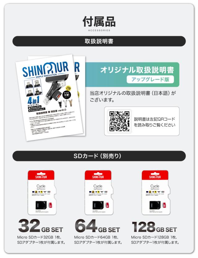 | 付属品 | ・SDカードリーダーx1個 ・日本語説明書(PDF) ※SDカード、microSDカード別売り |