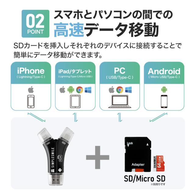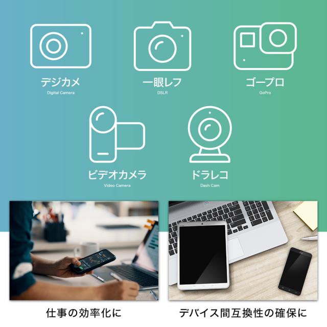 スマホ SDカードリーダーにより スマホの容量不足、ストレージ対策に SDカードリーダーがあればSDカードや PCにデータ移動がラクラク 大切な子供の写真や動画のバックアップが可能 PC、タブレット、スマホのデータ転送 相互交換、作業の効率化へ ほぼ全てのデバイスに対応 スマホからスマホへのデータ転送 クラウドやメール、Line等の 煩わしい通信制限の心配なし WiFi、スマホの通信も必要なし Googleフォト 有料化に伴う代替えに デジカメやビデオカメラ、アクションカメラ等で 撮った写真や動画を、スマホやタブレットで視聴できます。 最大1TB対応で大量の思い出を1枚のSDカードに投入可能! |