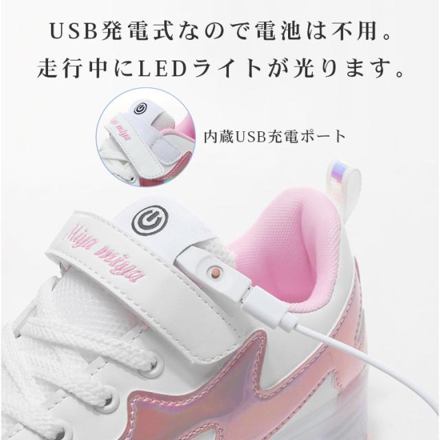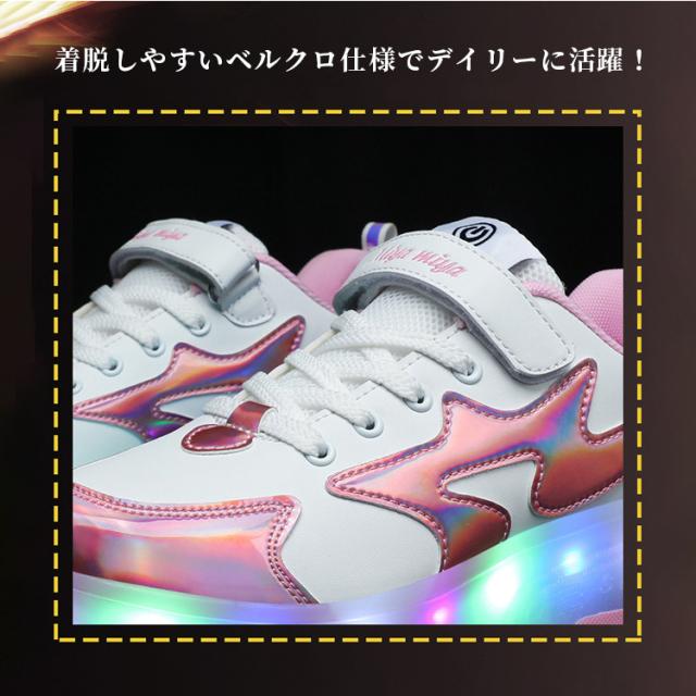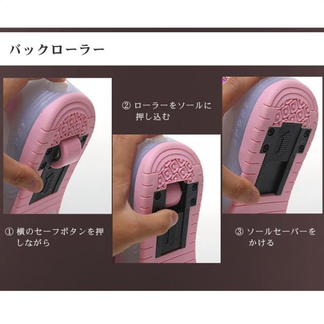 女の子にも男の子にも大人気のローラーシューズです。 ソールの一部ではなく、全周ぐるっと360度に内蔵された華やかなLEDがお子様のテンションを↑↑↑ シューズの裏側まで光るのでハイテク感抜群。どの角度からでも視認性が高いので事故の防止にも繋がります。