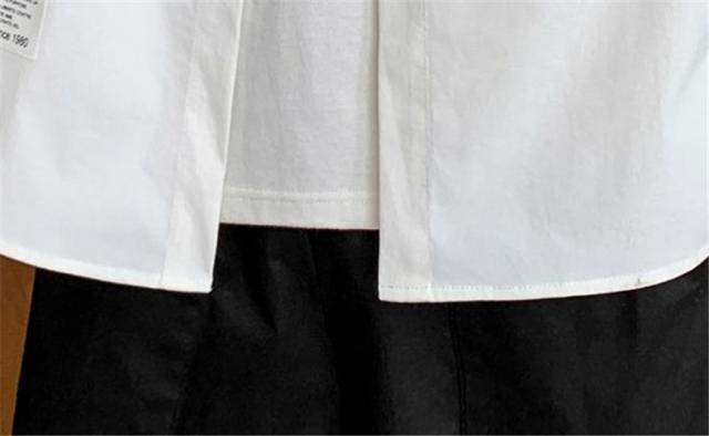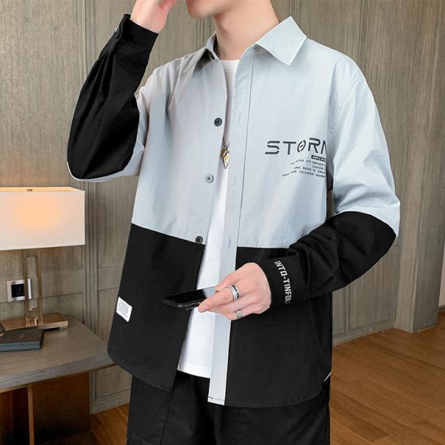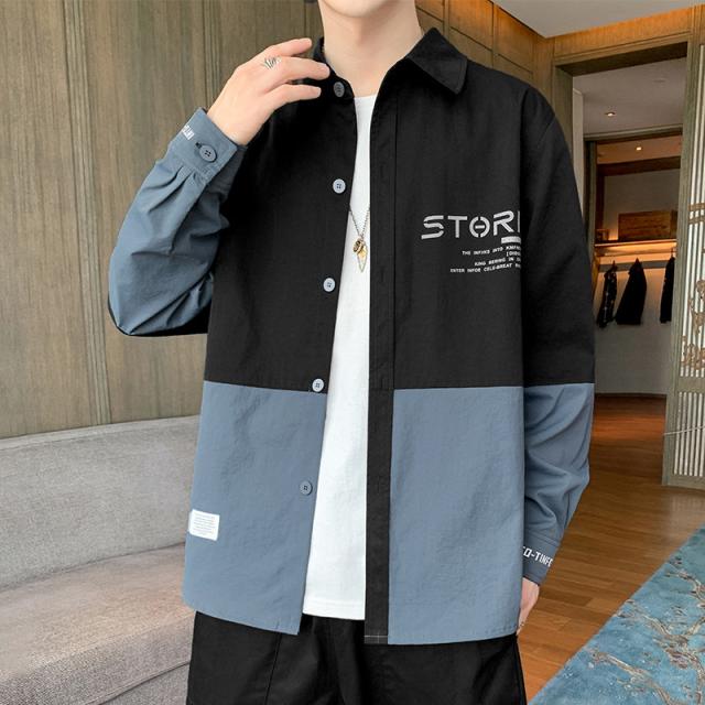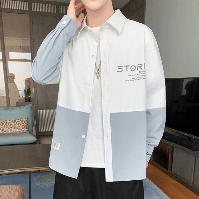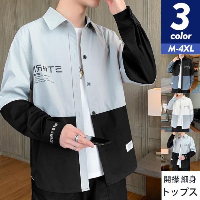 シャツ メンズ カジュアルシャツ 長袖 ブラウス ボタンダウン 開襟 英文字 バイカラー 切り替え 大きいサイズ 細身 春夏 通学