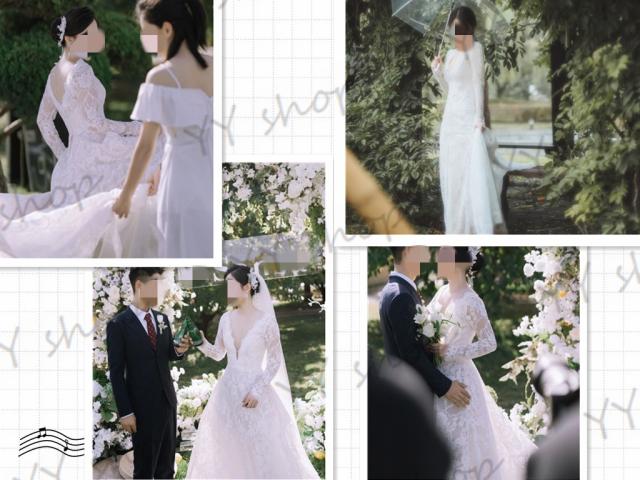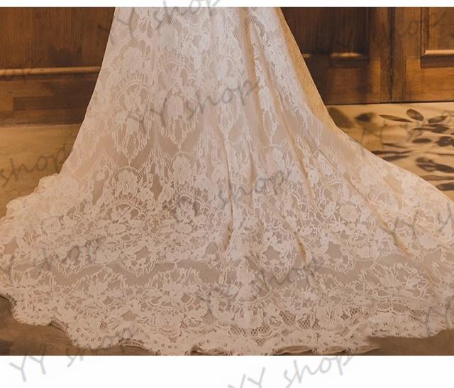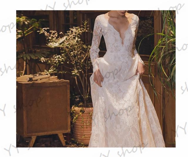 復古調 高級レース ウェディングドレス トレーン Vネック 長袖 バックレス 白 ホワイト XS~XL 結婚式 二次会 撮影 イベント H018