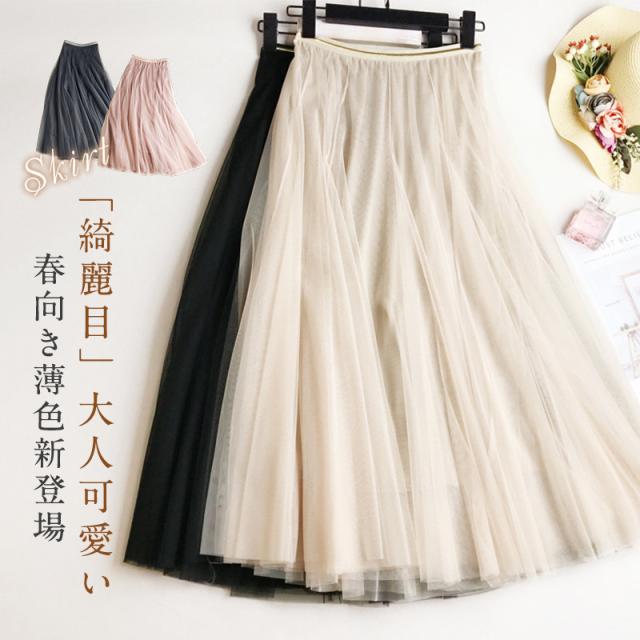 スカート チュールスカート 春夏コーデ フレアスカート ロングスカート ウエストゴム マキシ丈 ミモレ丈 お花見 春 おしゃれ フ
