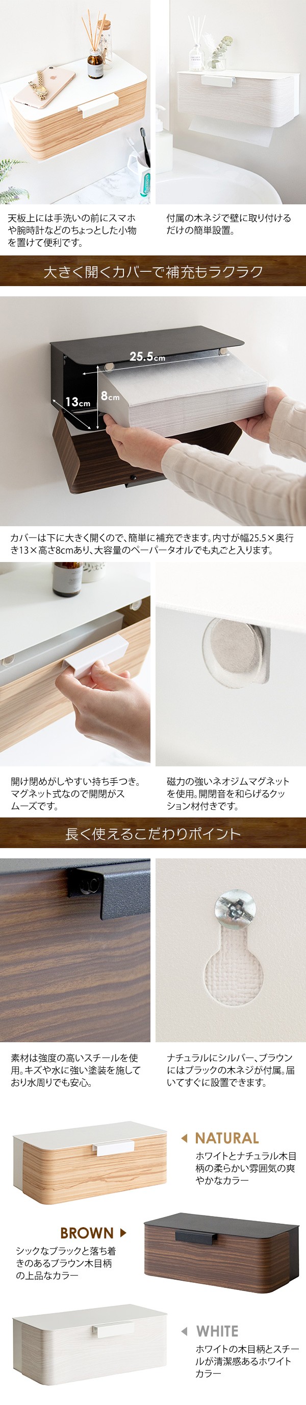 ペーパータオル ホルダー キッチンペーパー 収納 天板フラット 簡単取付 隠せる収納 片手で使える おしゃれ コンパクト 省スペース ティッシュペーパー 壁掛け 壁付け 木目柄 スチール 北欧風 かわいい お洒落 ブラウン ナチュラル ホワイト 幅28cm 奥行16cm 高さ10.5cm