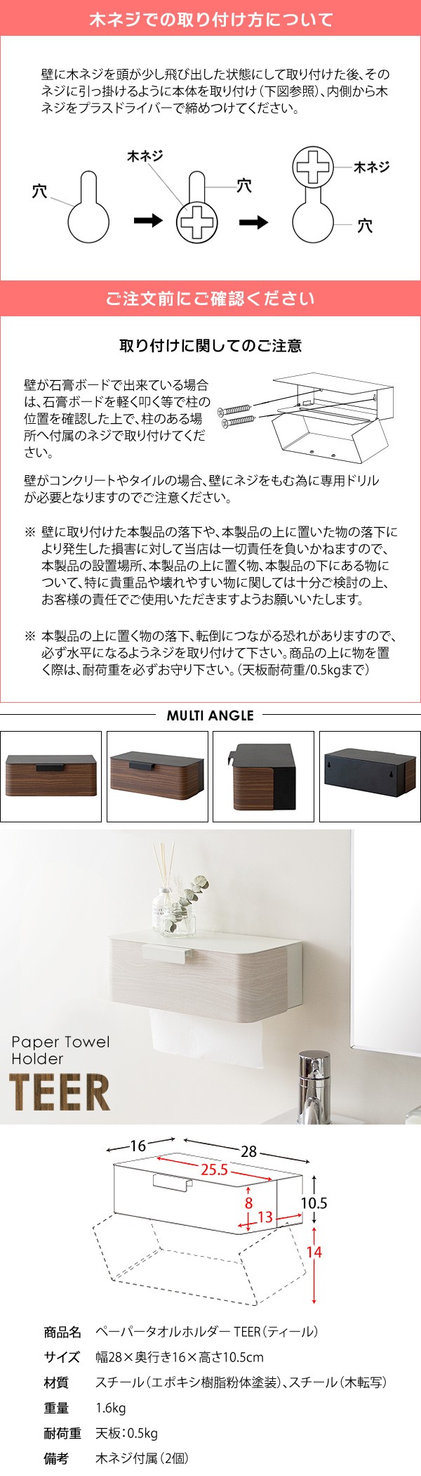 壁にネジ止めするだけの簡単設置で、省スペースに洗面所やキッチンで使用することができます。ホルダーに収納しておくことでペーパータオルをいつも清潔に保てます。大きく開くカバーで補充もラクラク。