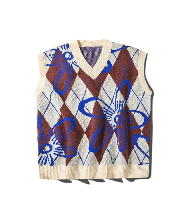 【HOOK】アーガイルチェックと花柄ニットベスト