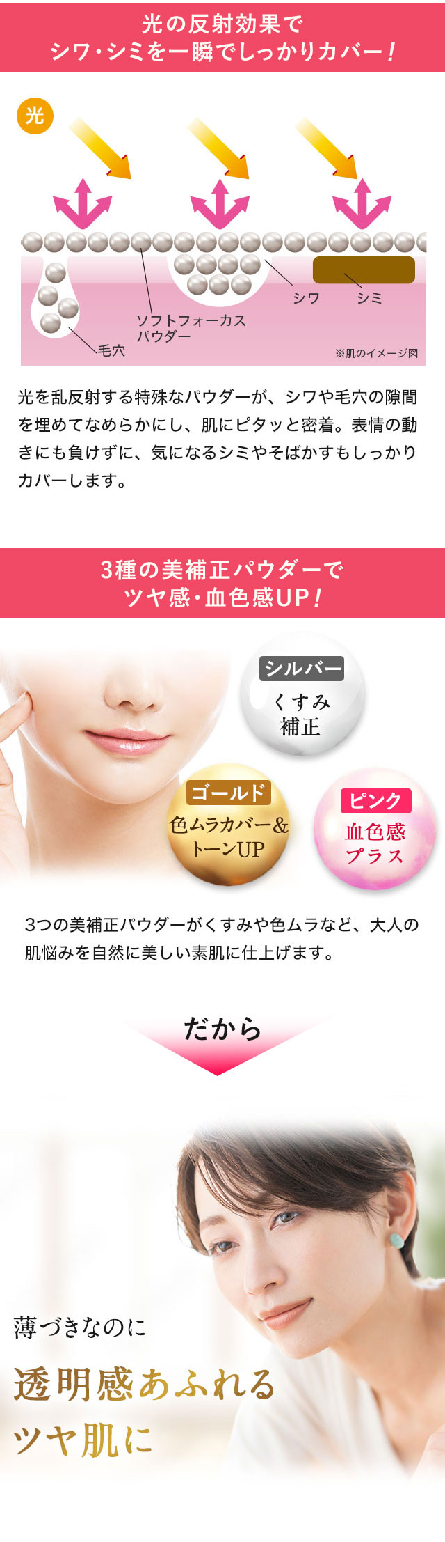 | シクロペンタシロキサン、水、酸化亜鉛、酸化チタン、ジフェニルシロキシフェニルトリメチコン、ナイアシンアミド、BG、グリセリン、テトラエチルヘキサン酸ペンタエリスリチル、PEG/PPG−19/19ジメチコン、PEG−10ジメチコン、PEG−9ジメチコン、酸化鉄、硫酸Mg、ジメチコン、セスキオレイン酸ソルビタン、(HDI/トリメチロールヘキシルラクトン)クロスポリマー、ハイドロゲンジメチコン、フェノキシエタノール、(ジメチコン/ビニルジメチコン)クロスポリマー、エチルヘキシルグリセリン、カプリル酸グリセリル、水酸化Al、リンゴ酸ジイソステアリル、含水シリカ、トリエトキシカプリリルシラン、シリカ、マイカ、フランスカイガンショウ樹皮エキス、テトラヘキシルデカン酸アスコルビル、ツボクサエキス、スクワラン、シア脂、コラーゲン、3−O−エチルアスコルビン酸、アルガニアスピノサ核油、アルブチン、メタクリル酸メチルクロスポリマー、加水分解ヒアルロン酸アルキル(C12−13)グリセリル、オリーブ果実油、デキストリン、エタノール、サトザクラ花エキス、PG、PVP、プルーン分解物、加水分解シルク、リンゴ酸、アスコルビン酸、加水分解エラスチン、コメヌカエキス、キハダ樹皮エキス、プラセンタエキス、サッカロミセス/(黒砂糖/プラセンタエキス)発酵液、ラベンダー花エキス、ヒメフウロエキス、加水分解コラーゲン、セージ葉エキス、カミツレ花エキス、オウゴン根エキス、オトギリソウ花/葉/茎エキス、加水分解コンキオリン、プラセンタ脂質、クオタニウム−18、クエン酸Na、アロエベラ葉エキス、ダイズ種子エキス、クオタニウム−33、水溶性コラーゲン、水溶性コラーゲンクロスポリマー、サクシノイルアテロコラーゲン、コレステロール、アーチチョーク葉エキス、セラミドNG、フラーレン、セラミドAS、セラミドNP、セラミドAP、セラミドEOP |