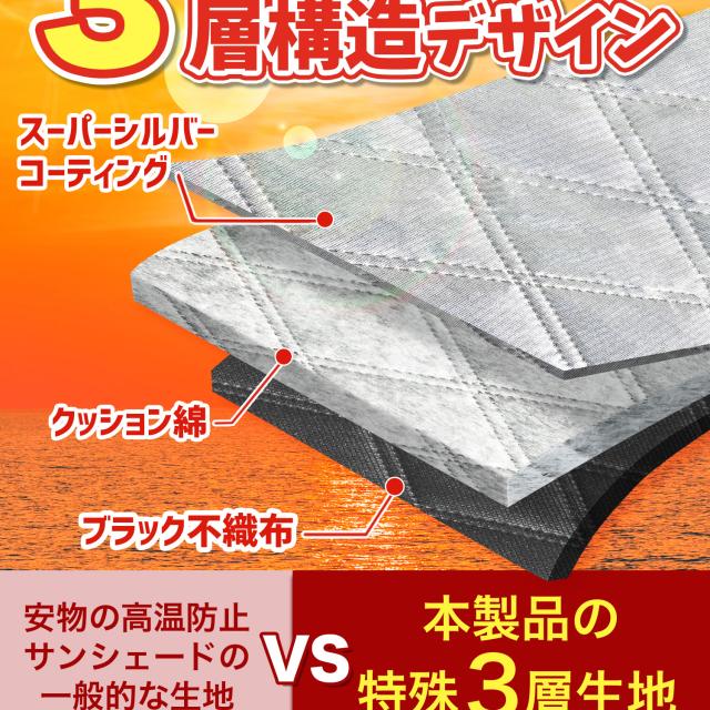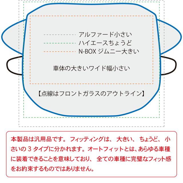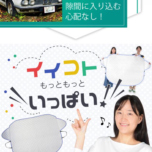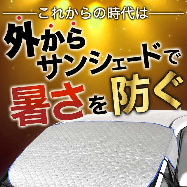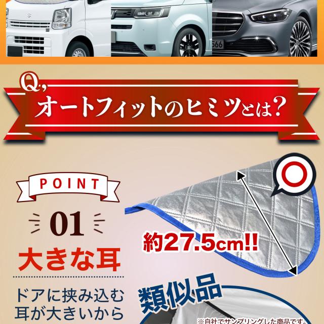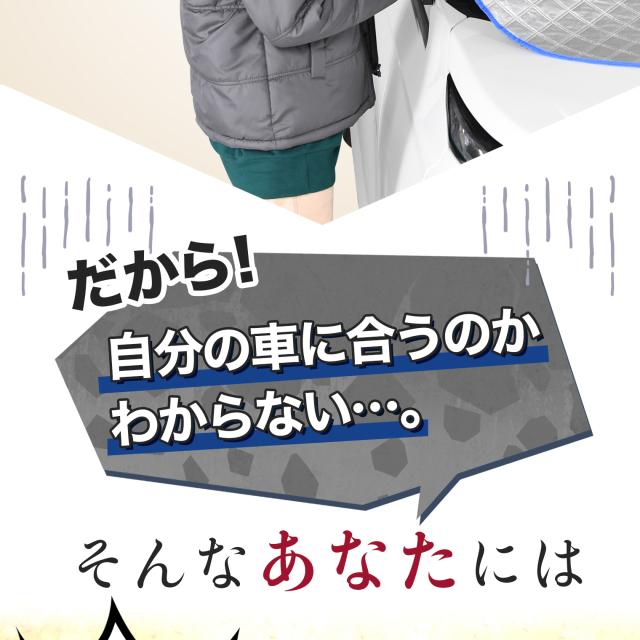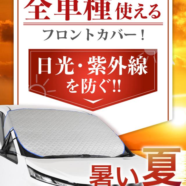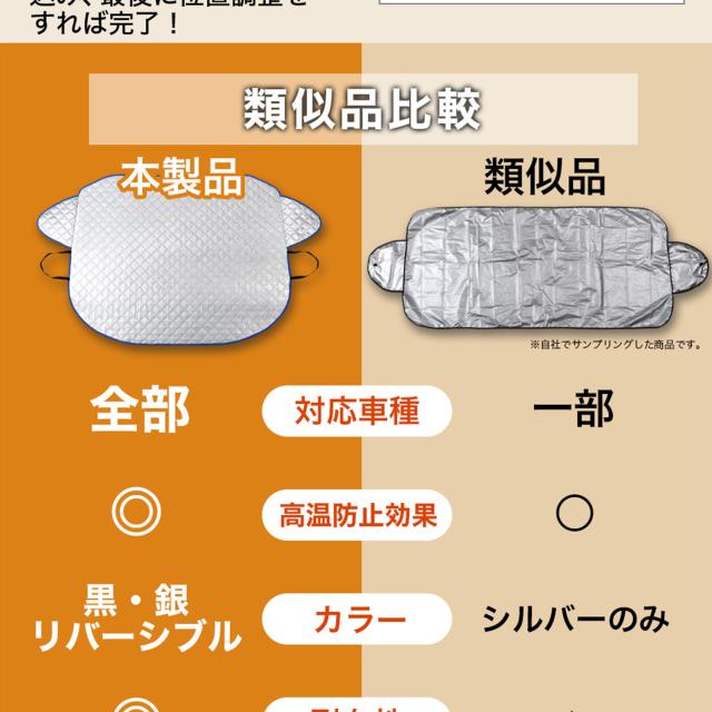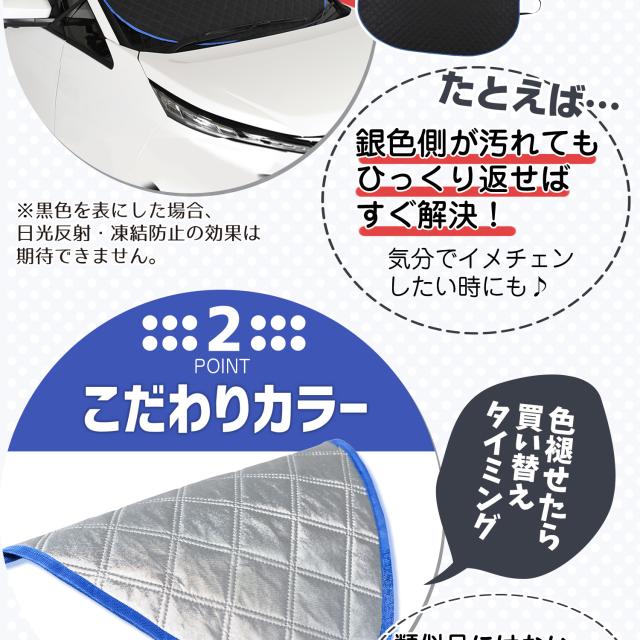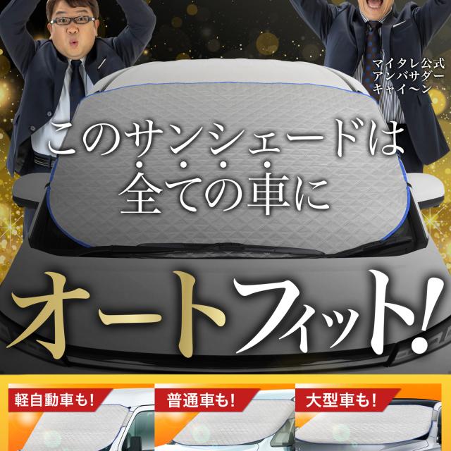 【商品内容】高熱防止サンシェード1枚【商品の特徴】1. オートフィット ※一部適合しない車種もございます。軽自動車、普通車、大型車、幅広いお車に適合するサイズです。「安定フィットのビッグサイズ」ドアに挟む耳やゴムバンド、シェードの面積を他製品より大きくすることでフロントガラスをより広く覆い、安定フィットします。2. こんなのあり?銀か黒をリバーシブルリバーシブルでも使えるので、片面が汚れても裏返して使用したり、気分に合わせて見た目をドレスアップできます。また、冬は雪や雨で濡れたサンシェードを乾かすことも可能です。3. 一目でわかる!買い替えタイミング他にはない、オシャレな青色バイアステープを使用しています。青いテープが色あせてきたら買い替えのタイミングです。【取り付け方】1. 本体をフロントガラスへ広げ中央に合わせます。※銀色を表面、黒を裏面にしてお取り付けください。※黒色を表にした場合、温度上昇防止効果・凍結防止効果が期待できません。また、長時間の使用で色抜けする場合もございます。2. ゴムバンドをサイドミラーの片方に引っ掛け、もう片方も固定します。次に、ドアを開け、耳部分をドアで挟み込みます。※一部耳が挟めない車種がございます。その場合、ゴムバンドのみで固定してください。【警告】●強風で飛ばされそうな場合は、本製品をお車から外して、絶対に使用しないでください。台風や突発的な強風、豪雨で本製品が飛ばされた場合、補償の対象外となります。また、飛ばされた製品が原因で近隣の住宅や車に損害を与えたり、通行人にケガを負わせてしまう可能性もございますので、風が強い日は使用しないでください。●本製品は簡易シェード、消耗品でございます。●中(半年)、長期(一年以上)の耐久性は保証できません。使用状況や使用年数によって、変色や防水ラミネート、撥水加工等の経年劣化が起こります。●発火、火災の危険がありますので、本製品の近くで火気の使用はお止めください。●走行中の使用は絶対におやめください。●本製品の上で鋭利な荷物を引きずったり、強い力で一点に負荷をかけると製品が破損する恐れがございます。●ゴムバンドや縫い目には防水・撥水機能が施されておりませんのでご注意ください。●カバーが汚れた場合は、濡らしたタオル等でお拭き取りください。【知的財産について】本ページのデザインやレイアウト、写真やテキスト、実験・検証結果をコピー・引用する行為は著作権侵害に該当します。万が一不正を発見した場合、楽天市場出店規約15条1項、18条1項に基づき出店停止処分となります。【販売条件の違い】本製品は素材機能をメーカーのギャランディどうりご提供させていただくため、製造ロットを表題の末尾で管理しております。 各、商品ページにある表題末尾の数字が小さいほど生産された後、年数が経過している商品となります。 また、末尾の数字が大きいほど新しく生産された製品です。耐久性の目安としてお選びください。