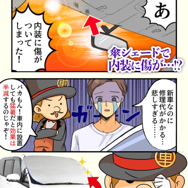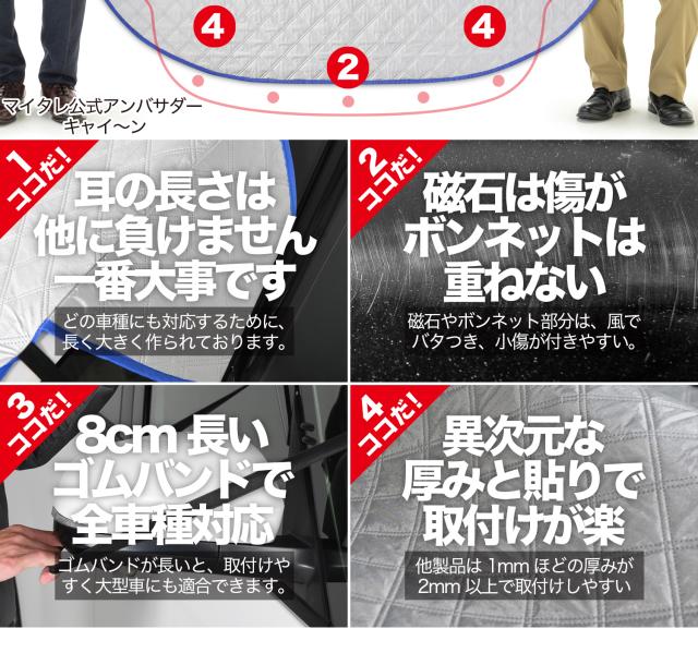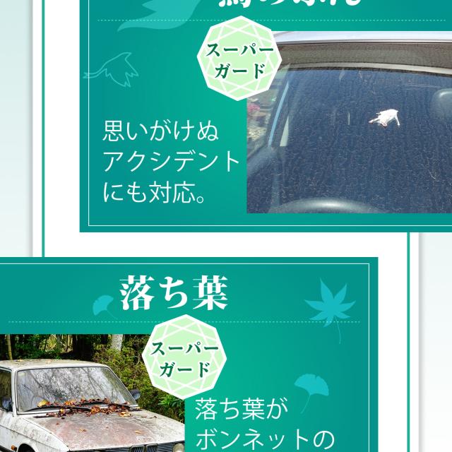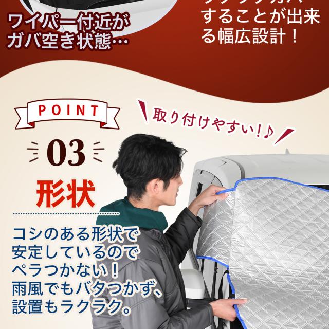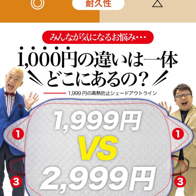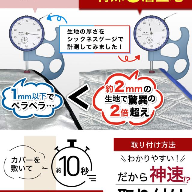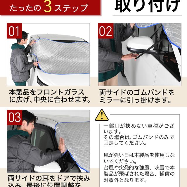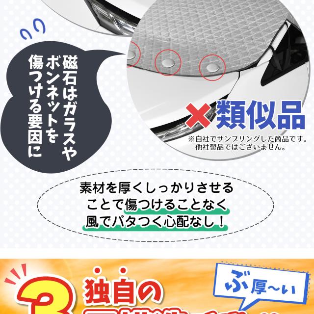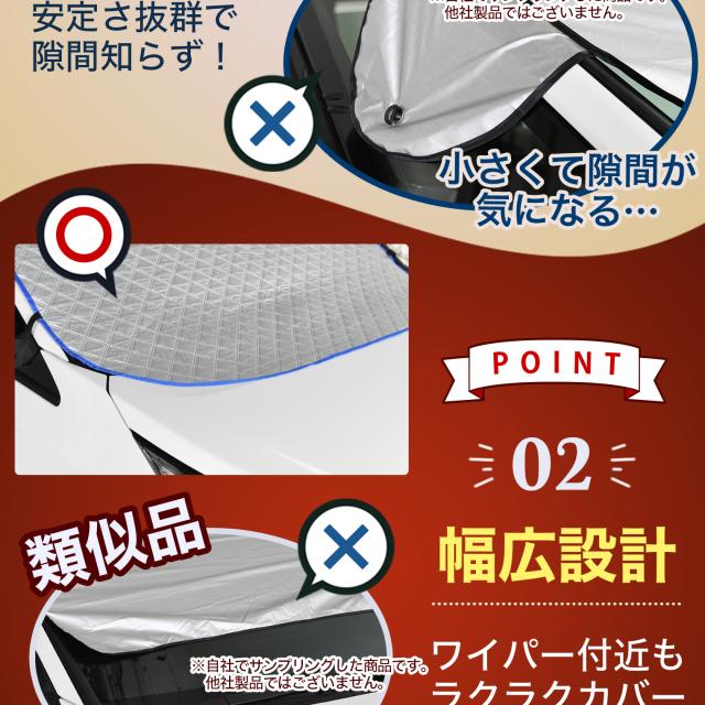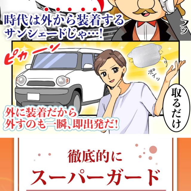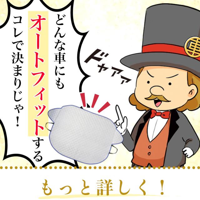 【商品内容】高熱防止サンシェード1枚【商品の特徴】1. オートフィット ※一部適合しない車種もございます。軽自動車、普通車、大型車、幅広いお車に適合するサイズです。「安定フィットのビッグサイズ」ドアに挟む耳やゴムバンド、シェードの面積を他製品より大きくすることでフロントガラスをより広く覆い、安定フィットします。2. こんなのあり?銀か黒をリバーシブルリバーシブルでも使えるので、片面が汚れても裏返して使用したり、気分に合わせて見た目をドレスアップできます。また、冬は雪や雨で濡れたサンシェードを乾かすことも可能です。3. 一目でわかる!買い替えタイミング他にはない、オシャレな青色バイアステープを使用しています。青いテープが色あせてきたら買い替えのタイミングです。【取り付け方】1. 本体をフロントガラスへ広げ中央に合わせます。※銀色を表面、黒を裏面にしてお取り付けください。※黒色を表にした場合、温度上昇防止効果・凍結防止効果が期待できません。また、長時間の使用で色抜けする場合もございます。2. ゴムバンドをサイドミラーの片方に引っ掛け、もう片方も固定します。次に、ドアを開け、耳部分をドアで挟み込みます。※一部耳が挟めない車種がございます。その場合、ゴムバンドのみで固定してください。【警告】●強風で飛ばされそうな場合は、本製品をお車から外して、絶対に使用しないでください。台風や突発的な強風、豪雨で本製品が飛ばされた場合、補償の対象外となります。また、飛ばされた製品が原因で近隣の住宅や車に損害を与えたり、通行人にケガを負わせてしまう可能性もございますので、風が強い日は使用しないでください。●本製品は簡易シェード、消耗品でございます。●中(半年)、長期(一年以上)の耐久性は保証できません。使用状況や使用年数によって、変色や防水ラミネート、撥水加工等の経年劣化が起こります。●発火、火災の危険がありますので、本製品の近くで火気の使用はお止めください。●走行中の使用は絶対におやめください。●本製品の上で鋭利な荷物を引きずったり、強い力で一点に負荷をかけると製品が破損する恐れがございます。●ゴムバンドや縫い目には防水・撥水機能が施されておりませんのでご注意ください。●カバーが汚れた場合は、濡らしたタオル等でお拭き取りください。【知的財産について】本ページのデザインやレイアウト、写真やテキスト、実験・検証結果をコピー・引用する行為は著作権侵害に該当します。万が一不正を発見した場合、楽天市場出店規約15条1項、18条1項に基づき出店停止処分となります。【販売条件の違い】本製品は素材機能をメーカーのギャランディどうりご提供させていただくため、製造ロットを表題の末尾で管理しております。 各、商品ページにある表題末尾の数字が小さいほど生産された後、年数が経過している商品となります。 また、末尾の数字が大きいほど新しく生産された製品です。耐久性の目安としてお選びください。