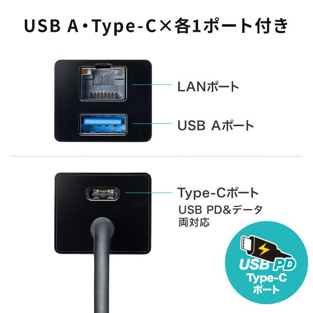 USBハブ LAN Type-C接続 小型 USB PD対応 USB-C2ポート Win/Mac対応 面ファスナー付[401-HUB3TCH04BK]