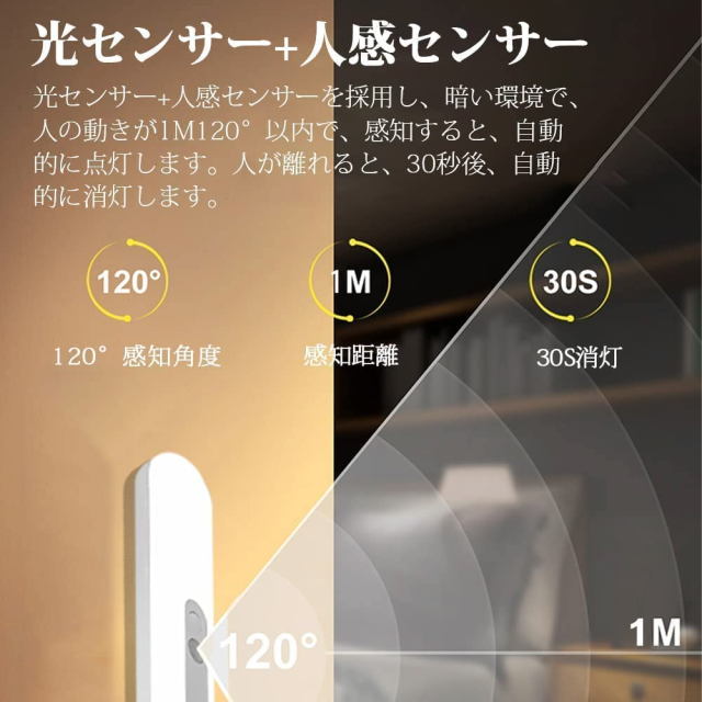 【常点灯モード】センサーライトは常点灯モードがあり、感知モードとの間で自由にスイッチできて、懐中電灯として緊急事態やアウトドアにも使用可能です。省エネのために、感知モードでは、暗い環境しか点灯しません。夜間の時、暗闇の環境に照明のスイッチを探すことが必要なく、生活を便利にしてくれるアイテムです。
