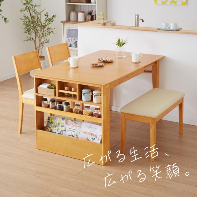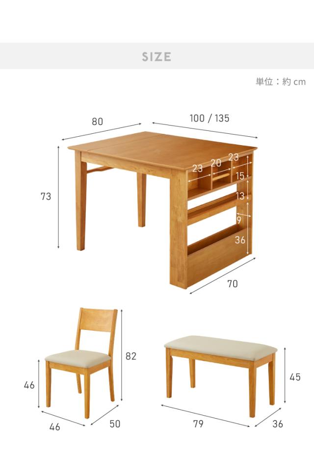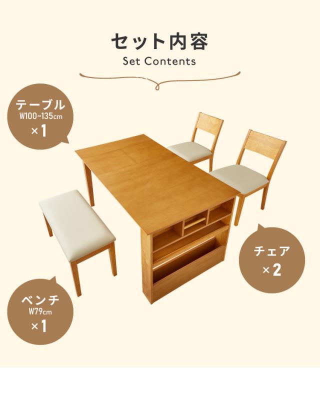 伸長式 ダイニングセット 2~4人用 ダイニングチェア2脚 ダイニングベンチ 収納付き 幅100~135cm 2人用 4人用 天然木 新生活 テーブル 食卓 木製 省スペース 北欧 モダン カントリー おしゃれ(代引不可)【送料無料】