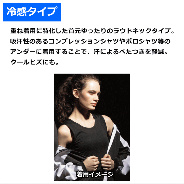 【特徴】●人気の3Dファーストレイヤーシリーズの冷感タイプ、重ね着用に特化した首元ゆったりのラウンドネックタイプ。吸汗性のあるコンプレッションシャツやポロシャツ等のアンダーに着用することで、汗によるべとつきを軽減。クールビズにも。●新開発のポリエチレン+吸汗ポリエステルの2層構(※特許出願中)素材、デユアルファブリックPLUS搭載。汗のべたつきを軽減するだけでなく、冷感機能を兼ね備え快適な着心地を保つ。