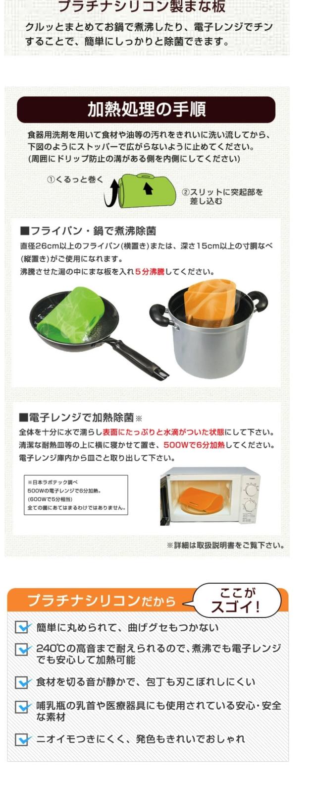 強力な薬剤を使用せずに、煮沸や電子レンジで除菌できるので、まな板をいつも清潔に保て