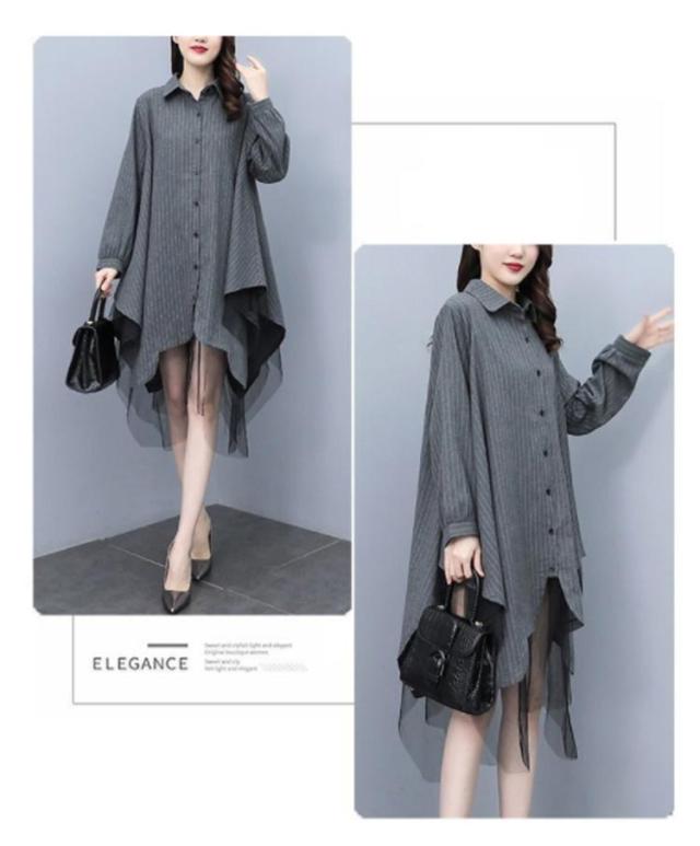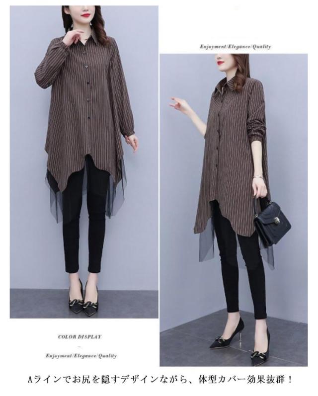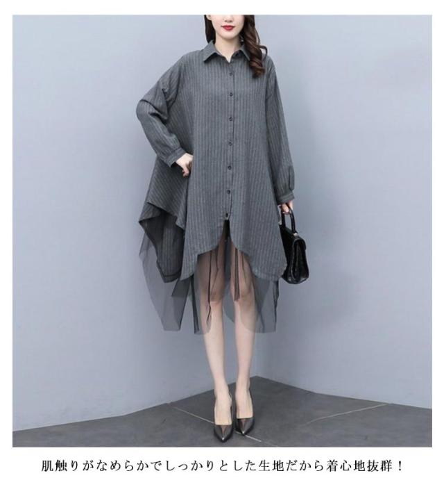 アシンメトリー シャツワンピース ワンピース チュニック ストライプ柄 チュール 切り替え ボリューム袖 シャツワンピ ロングシャツ レディース トップス 羽織り 大きいサイズ ゆったり 体型カバー 春 秋 L XL 2XL 3XL 4XL 5XL