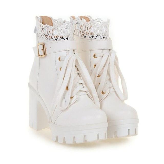 ショートブーツ レディース コスプレシューズ レース付き 黒 白 PU ショート丈 ハイヒール レースアップブーツ おしゃれ 無地 歩きやすい 通勤 通学 大きいサイズ 送料無料