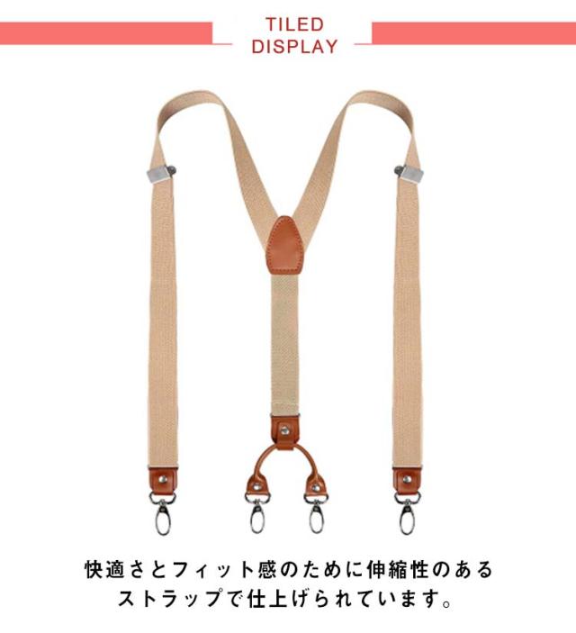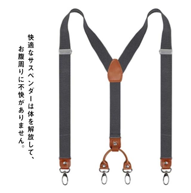 | カジュアルからフォーマルまで幅広く使われいるサスペンダー。 快適さとフィット感のために伸縮性のあるストラップで仕上げられています。 ウエストを締めつけ無くてもボトムスを固定できるので、苦しくありません。 快適なサスペンダーは体を解放して、お腹周りに不快がありません。 ゴム生地はアジャスターで細かなサイズ調節もできるので、サスペンダー メンズでのご利用は多いのですが男女問わずご使用いただけます。 背中はY型で前後2か所ずつ留めで、体型に合わせ安定してズボンを吊ること出来ます。合計4クリップで外れる心配がなくなります。 サスペンダー メンズとしても、サスペンダー レディースとしても使えます。 メンズ スーツのパンツに使ったり、ミニスカートにも使えます。 いろいろなお色を選んでいただけるのでビジネスにも、フォーマルにも、旅行、カジュアルに使えます。 | |