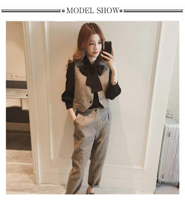 パンツスーツ 3点セット 上下セット レディース 長袖 テーパードパンツ ボウタイブラウス ベスト 前開き フロントボタン カジュアル 春 秋 無地 ブラウン