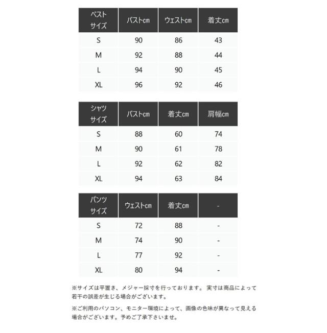 | サイズについての説明 | 【3点セット】ボウタイブラウス(ブラック)+ベスト(ブラウン)+テーパードパンツ(ブラウン) 【サイズ】画像を参照お願い致します。 ※上記サイズは平置き実寸になります。 サイズ表の実寸法は商品によって1-3cm程度の誤差がある場合がございます。 |