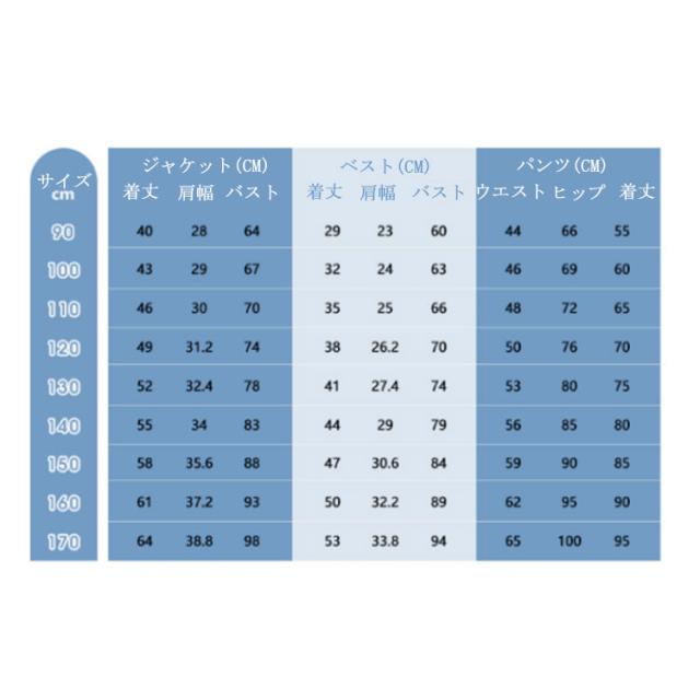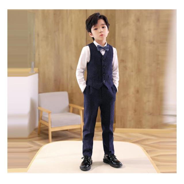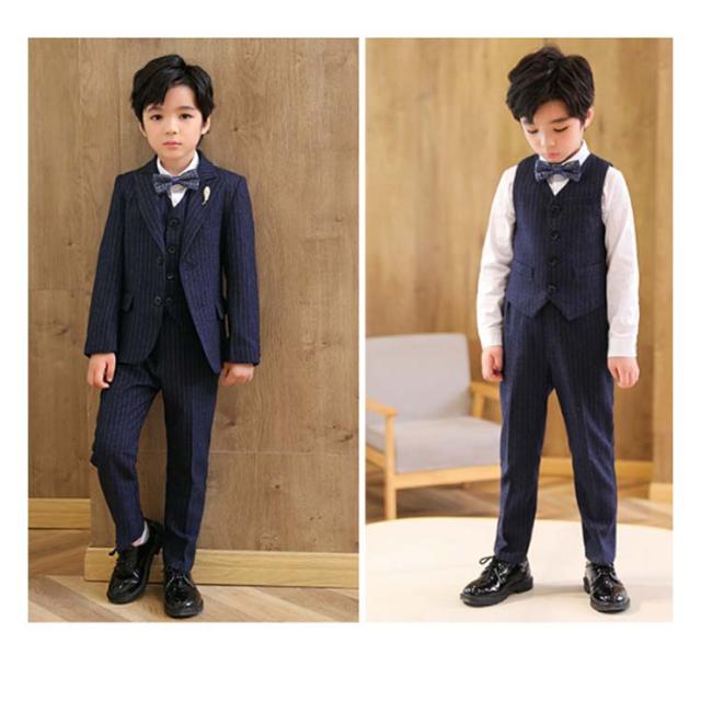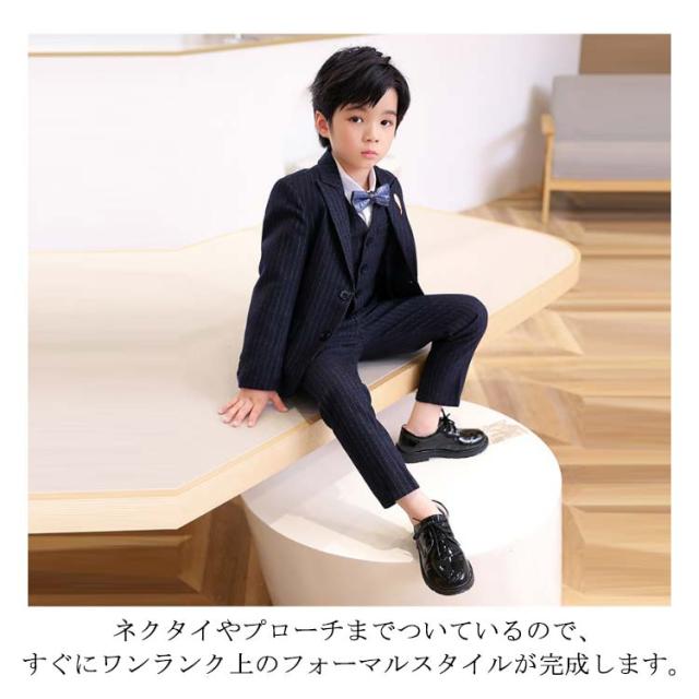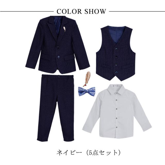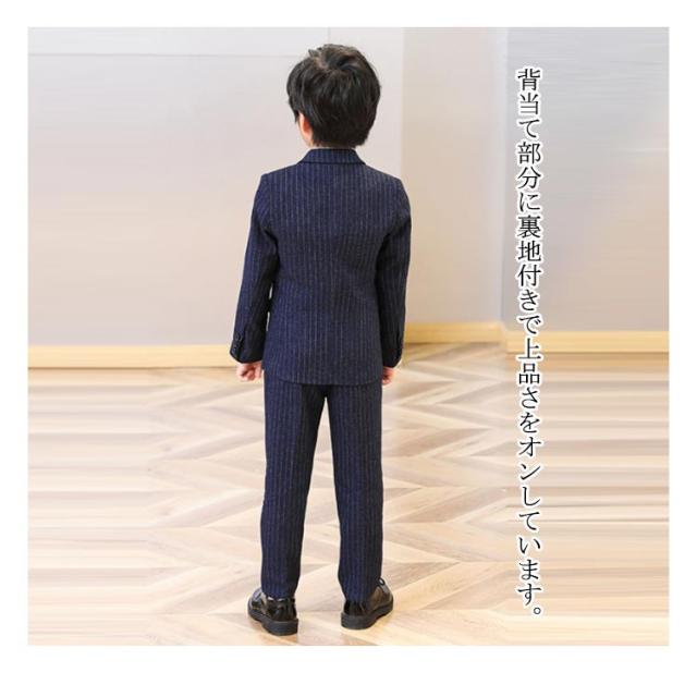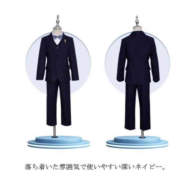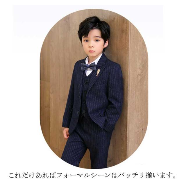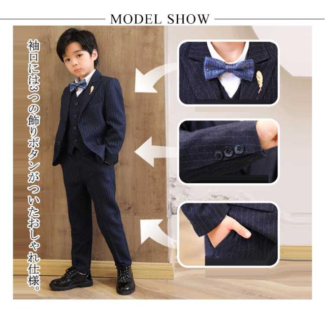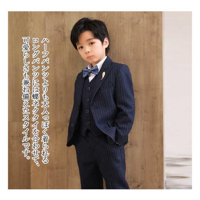 | 入園・入学だけでなく結婚式やお食事会、発表会など華やかなシーンを彩るストライプスーツセット。【6点セット】 ジャケット+ベスト+パンツ+シャツ+プローチ+ネクタイの6点セット これだけあればフォーマルシーンはバッチリ揃います。 落ち着いた雰囲気で使いやすい深いネイビー。 細身のラインがシャープなシルエットを強調します。袖口には3つの飾りボタンがついたおしゃれ仕様。背当て部分に裏地付きで上品さをオンしています。 ハーフパンツよりも大人っぽく着られるロングパンツには蝶ネクタイを合わせて、可愛らしさも兼ね備えたスタイルです。 ネクタイやプローチまでついているので、すぐにワンランク上のフォーマルスタイルが完成します。 卒業式や、結婚式、発表会など、セレモニーから冠婚葬祭まで幅広いシーンで活躍します。 | |
