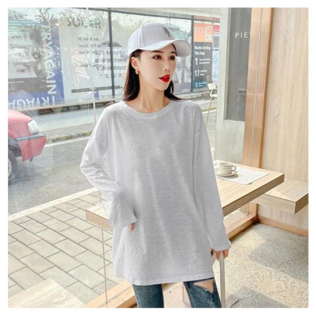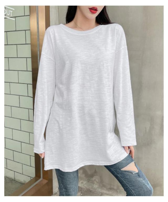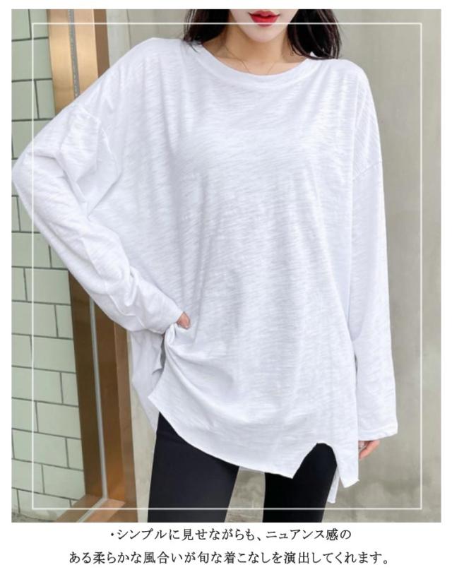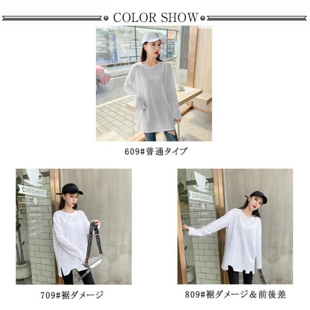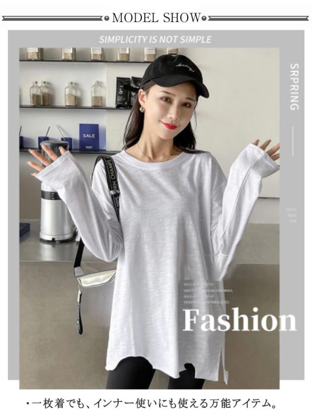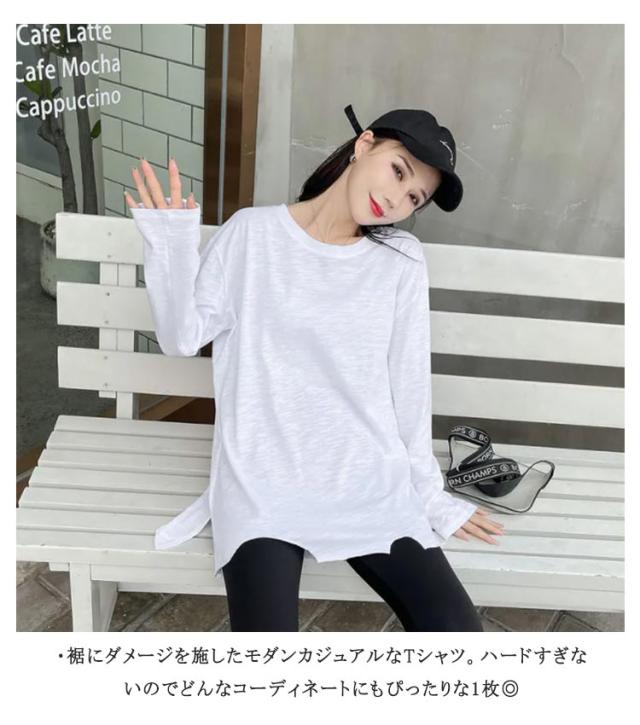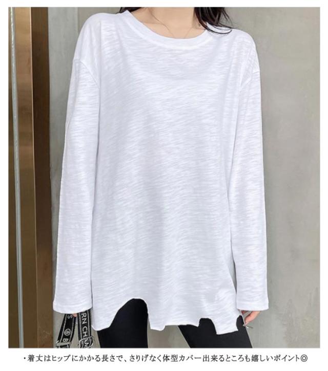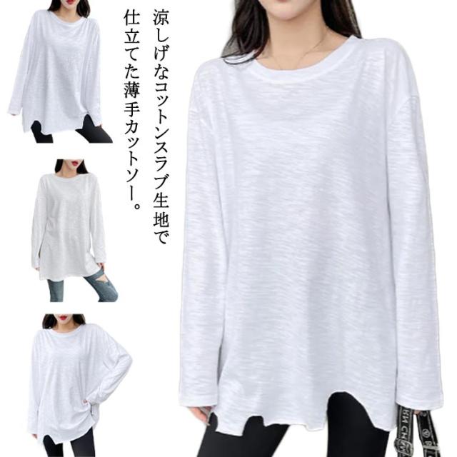 ロンt カットソー レディース ロング トップス 長袖 薄手 おしゃれ カジュアル 体型カバー 裾ダメージ加工 クルーネック 重ね着 インナー レイヤード シンプル 透け感 ゆったり 無地 ホワイト 全3タイプ