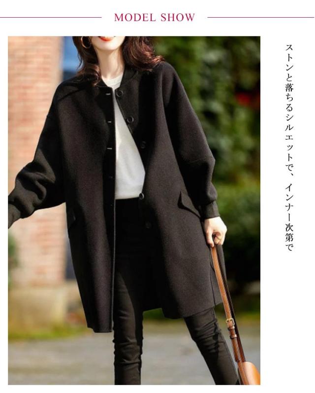 ノーカラーコート ロングコート ニットメルトン レディース 春秋冬 ロング 無地 ミドル丈 膝上 ボリューム袖 韓国風 秋アウター 春アウター ゆったり クルーネック ボリュームスリーブ 袖リブ おしゃれ きれいめ ゆったり 羽織る 黒コート 20代 30代 40代 50代