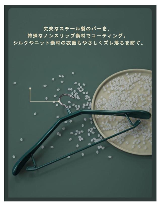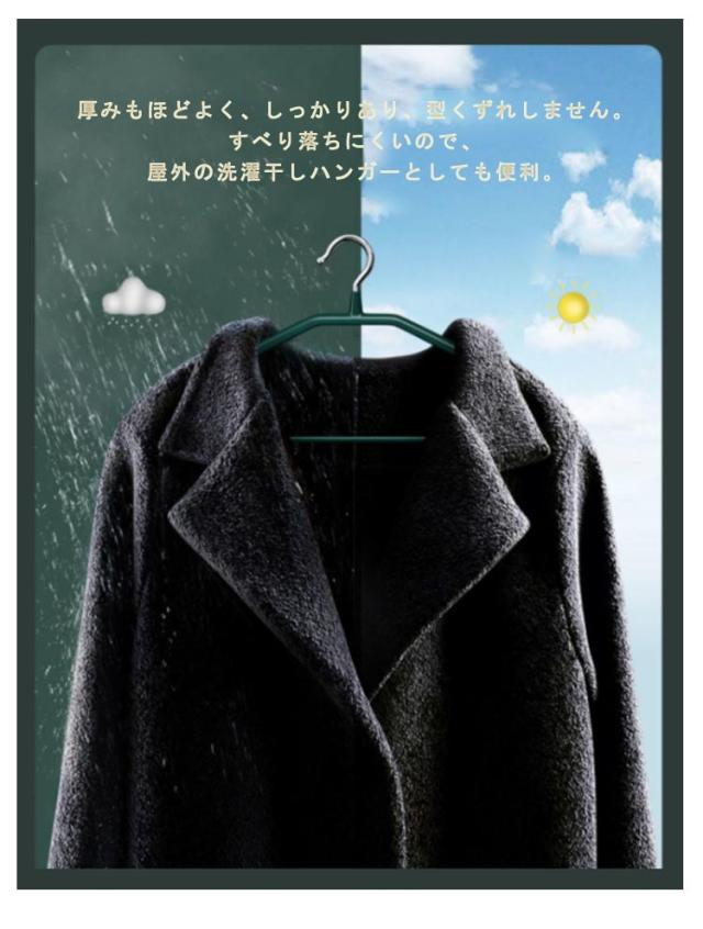 | スーツはもちろん、重いコートやジャケット、伸びやすいニット、滑りやすいブラウスやワンピースなど、幅広く使える。 肩に膨らみのある立体構造。 滑らない面が広いので、セーターのように重みで肩部が伸びやすい衣類も、型崩れしにくくキレイに保管できる。 丈夫なスチール製のバーを、特殊なノンスリップ素材でコーティング。 シルクやニット素材の衣類もやさしくズレ落ちを防ぐ。 厚みもほどよく、しっかりあり、型くずれしません。すべり落ちにくいので、屋外の洗濯干しハンガーとしても便利。 | |