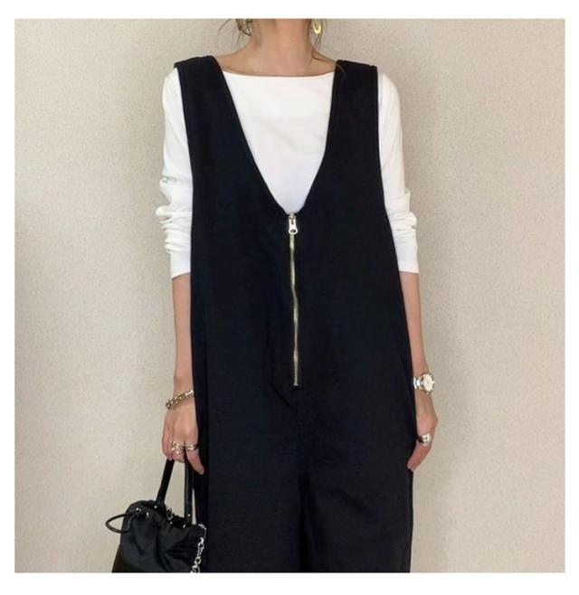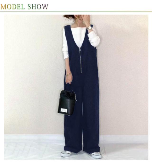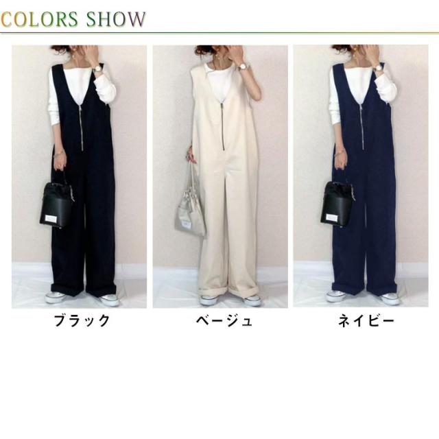 全4色 サロペットパンツ レディース 深Vネック オールインワン ワイドパンツ オーバーオール フロントジップ ゆったり ロングパンツ レイヤード風 リラックス 大人カジュアル ルーズ 春秋 冬 大きいサイズ 体型カバー