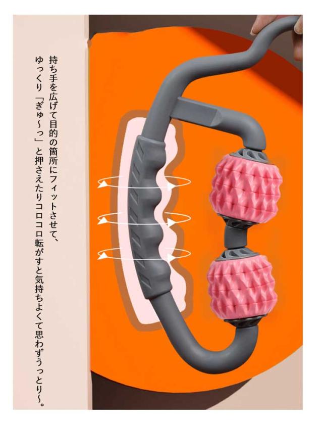 | マッサージローラーポロは挟む式なので、肌にピッタリくっついて、体を包んで360度均一にマッサージできます。 運動前のうオームアップや運動後のリラックス効果が抜群、全身の筋肉を揉み解せます。 仰向けに寝ながら、凝りのある箇所に直接あててゴロゴロとするだけでカンタンにマッサージできます。 復元力高いですので、太ももや腕などご自分に力を合わせてマッサージできます。 持ち手を広げて目的の箇所にフィットさせて、ゆっくり「ぎゅ〜っ」と押さえたりコロコロ転がすと気持ちよくて思わずうっとり〜。 マッサージローラーポロは高品質TPE材質を利用して、滑らかでバリのない表面は体にやさしく、ご安心に利用いただけます。 | |