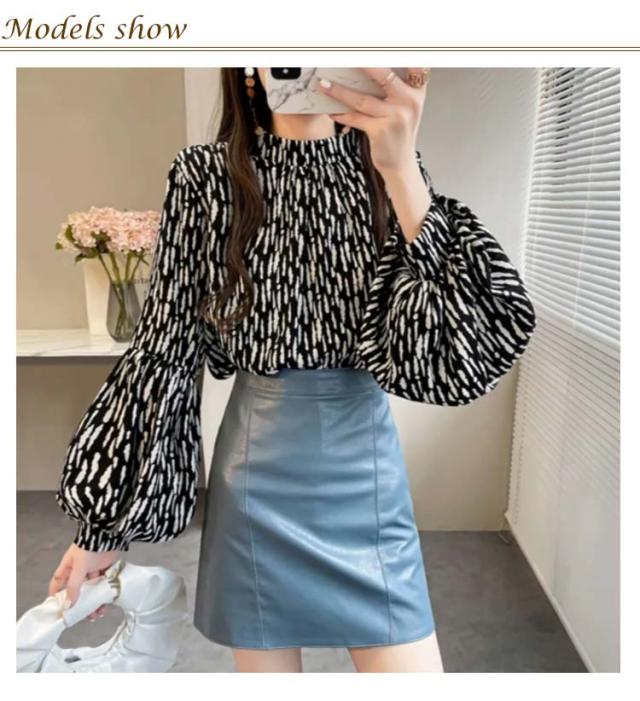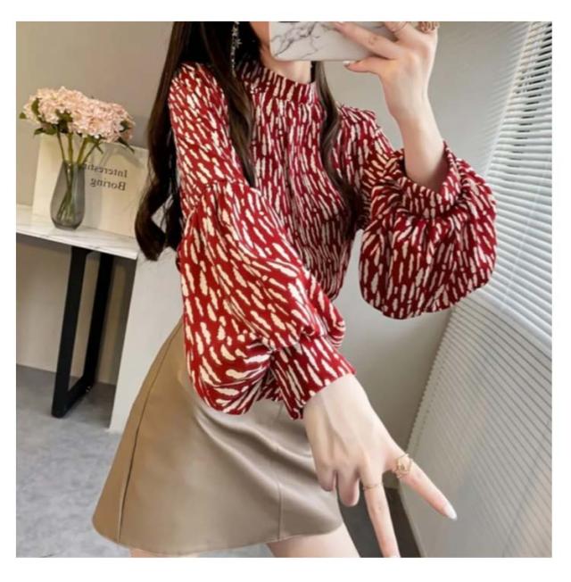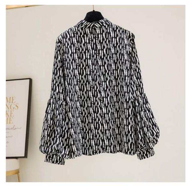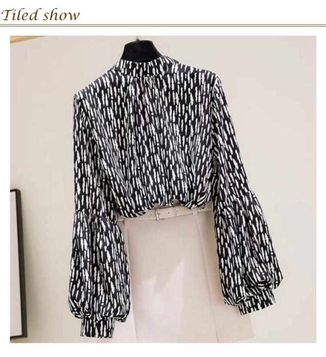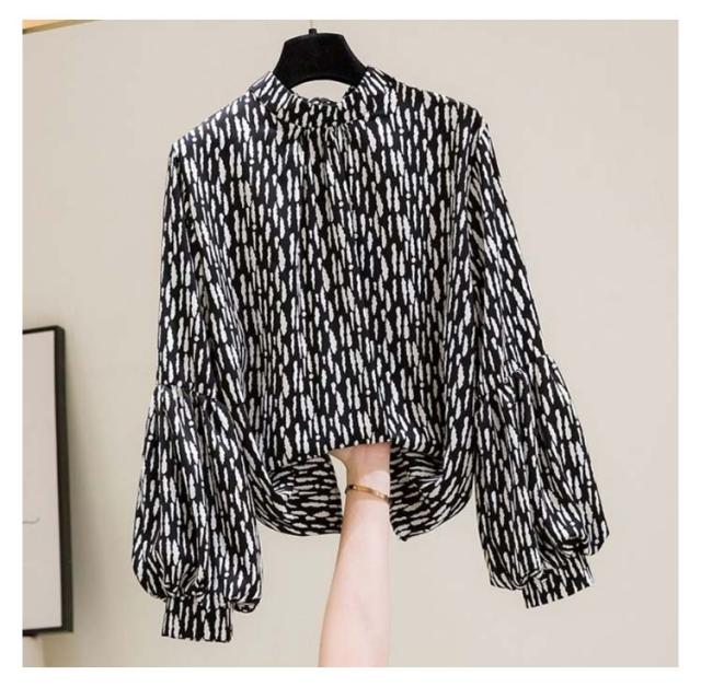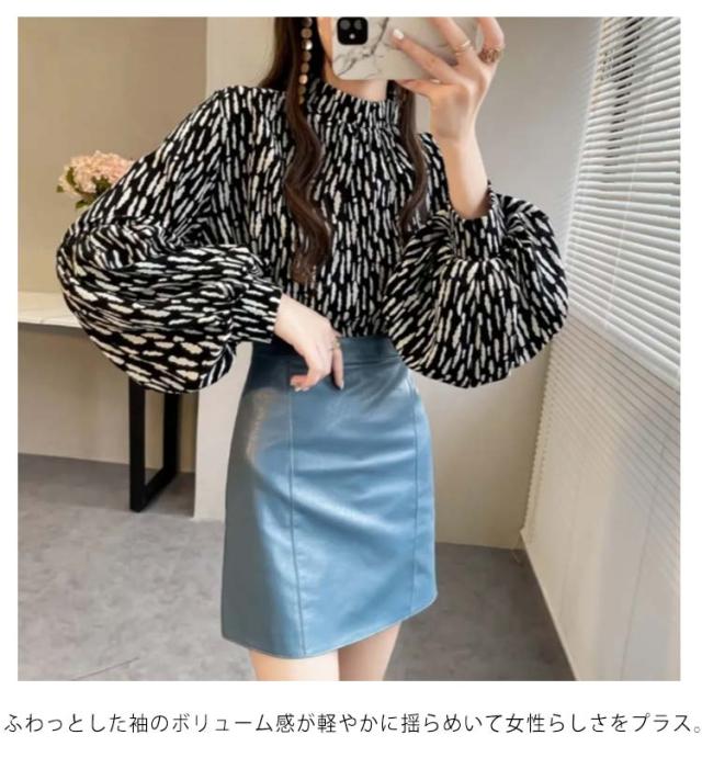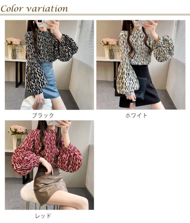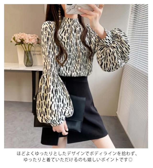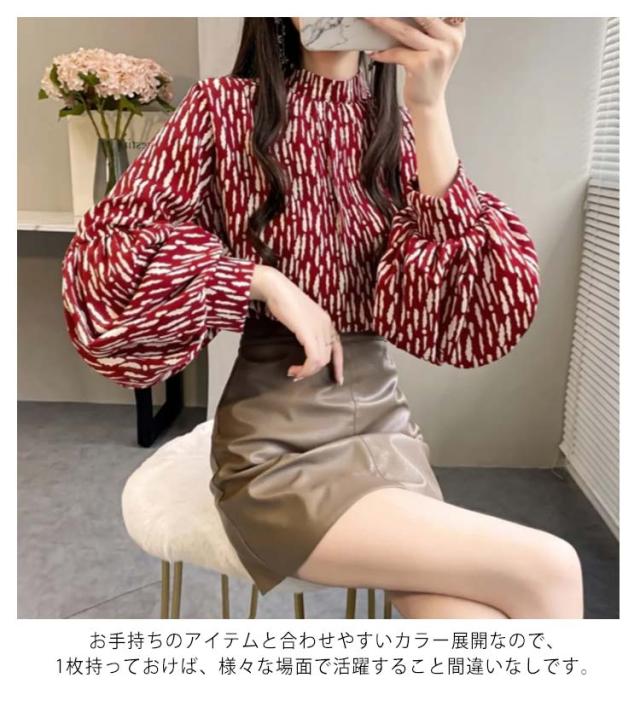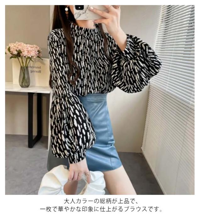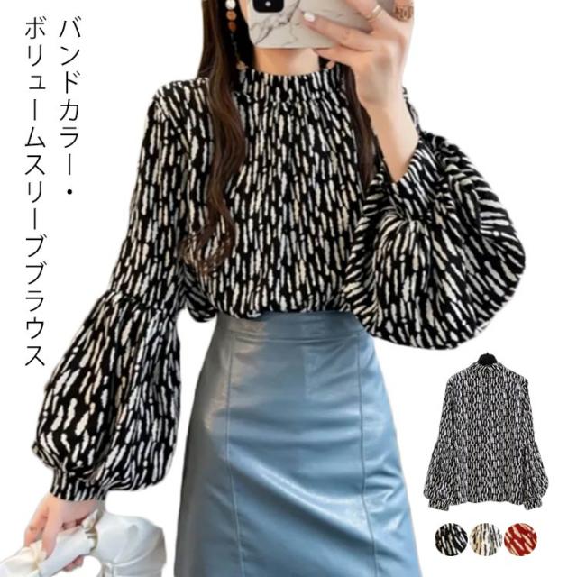 ブラウス レディース 長袖 シフォン ブラウス ボリュームスリーブ バンドカラー トップス シャツ 総柄 ボリューム袖 バルーンスリーブ ゆったり 体型カバー 上品 エレガント フェミニン フォーマル オフィス カジュアル おしゃれ 春 夏 秋 送料無料