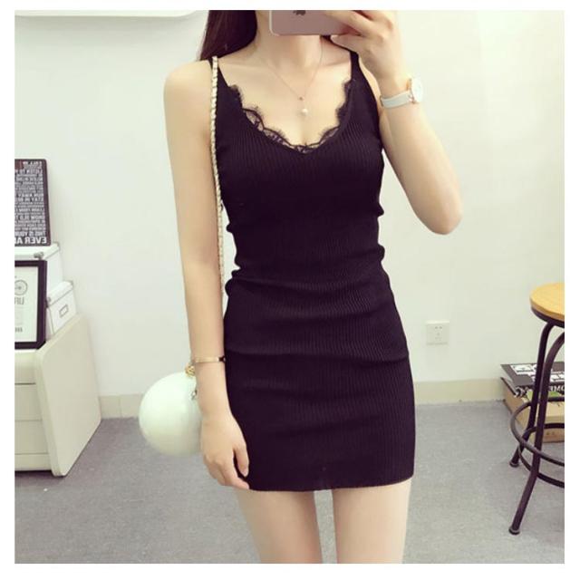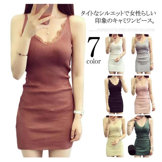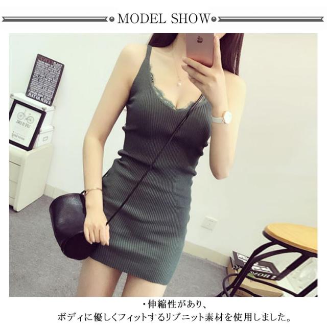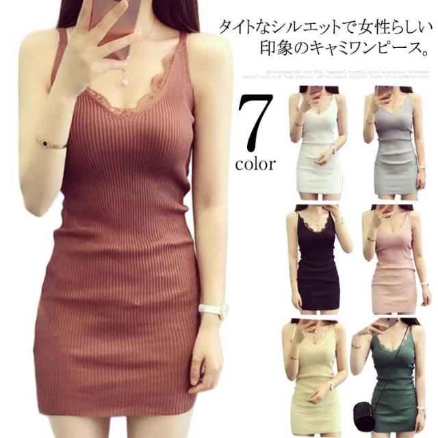 ロングキャミソール レディース ニットキャミソール Vネック レース ノースリーブ 袖なし 細身 タイト インナーワンピース ストレッチ 伸縮性 夏 フリーサイズ 無地 全7色