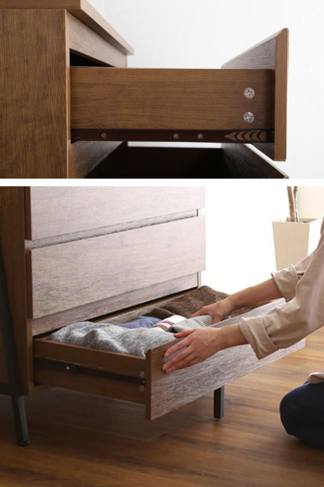 引出しは深さ約7.7cmあるので、厚みのある服も4杯の引出しでしっかり収納していただけます。一番下の引出しはフルスライドレールなので、奥の物まで見やすく取り出しやすいです。