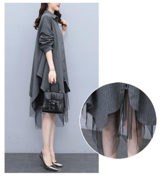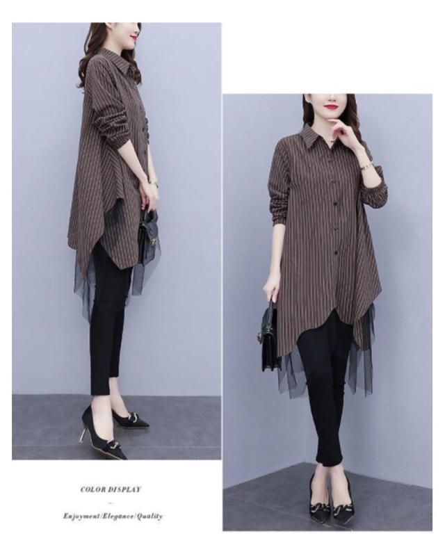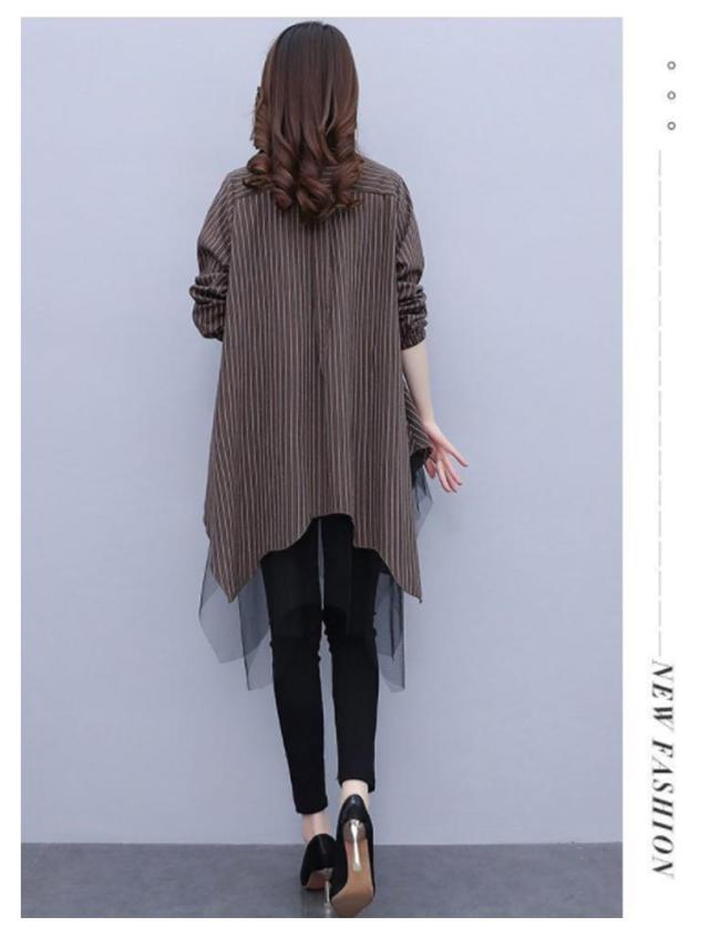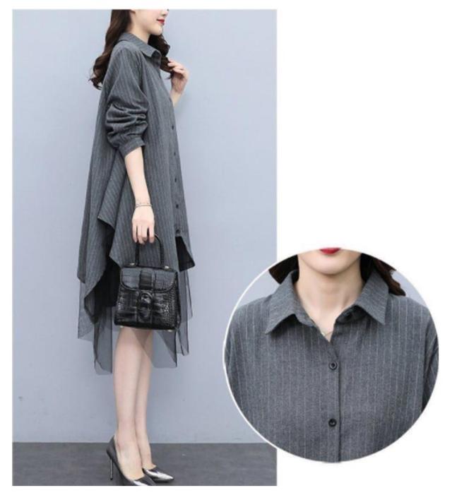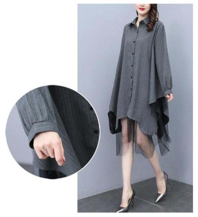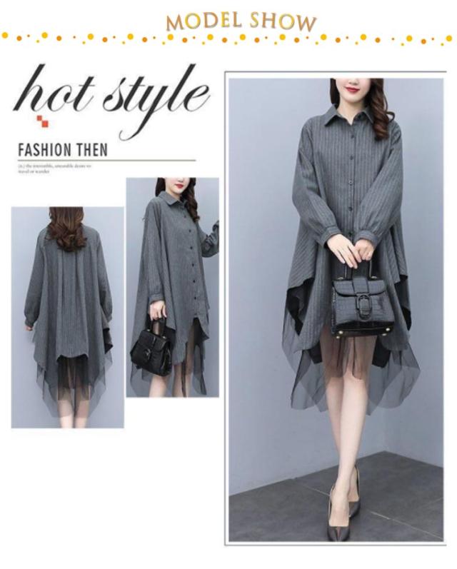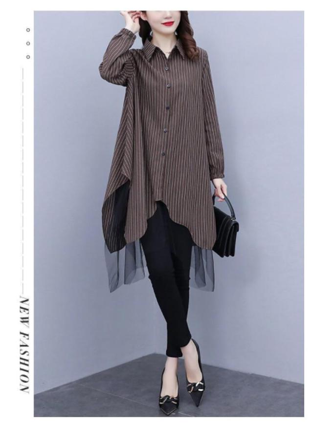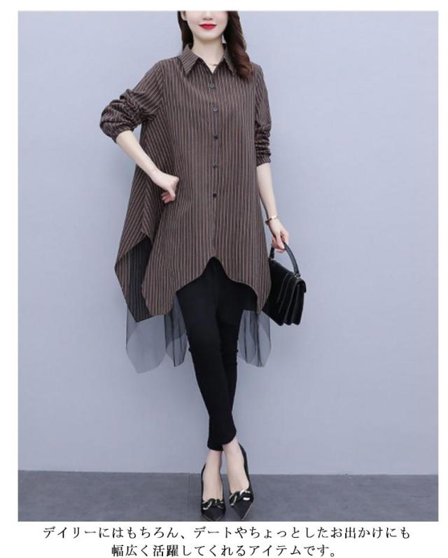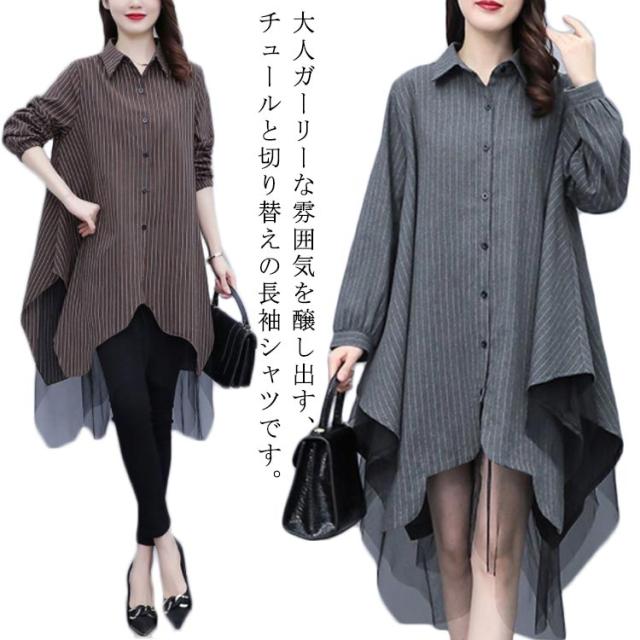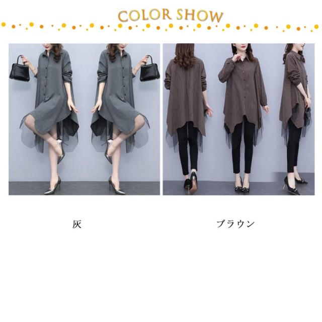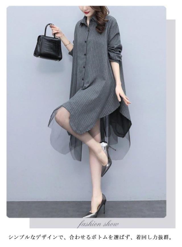 アシンメトリー シャツワンピース ワンピース チュニック ストライプ柄 チュール 切り替え ボリューム袖 シャツワンピ ロングシャツ レディース トップス 羽織り 大きいサイズ ゆったり 体型カバー 春 秋 L XL 2XL 3XL 4XL 5XL