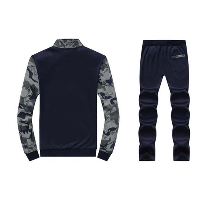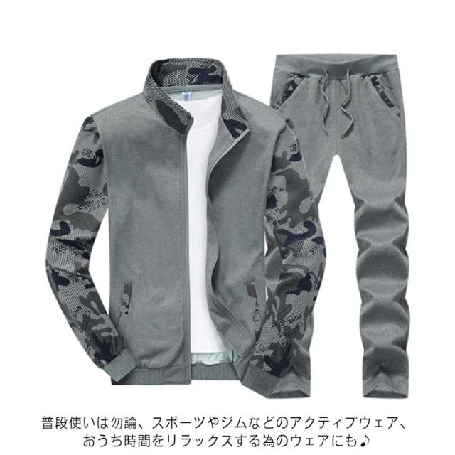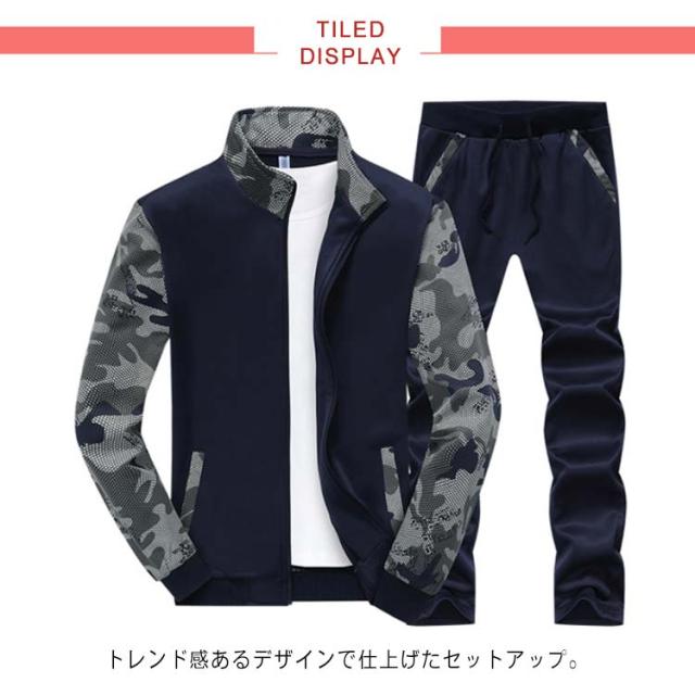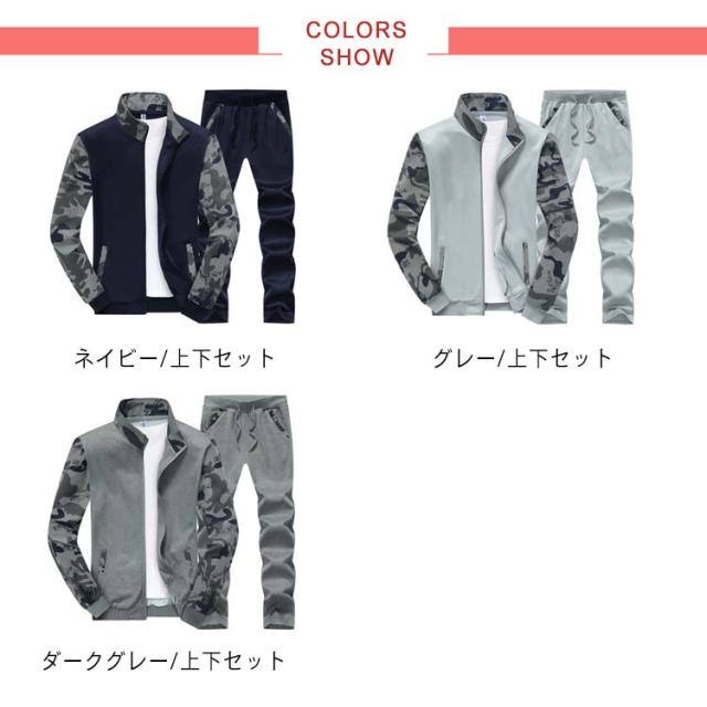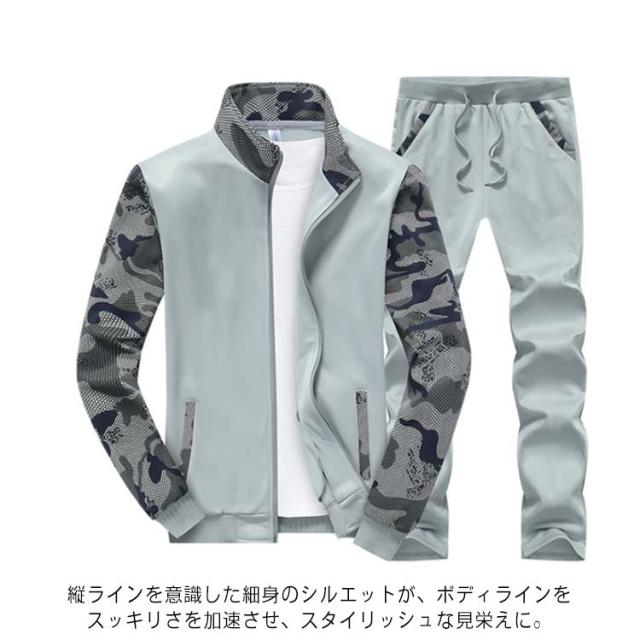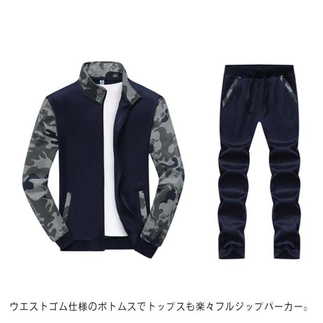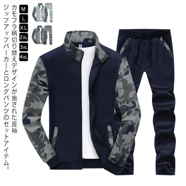 スウェットセットアップ メンズ 上下セット 切り替え 長袖 ジップアップ パーカー スウェット ウェストゴム ポケット付き 細身 カジュアル 男性 春 秋 大きいサイズ 迷彩柄 全3色
