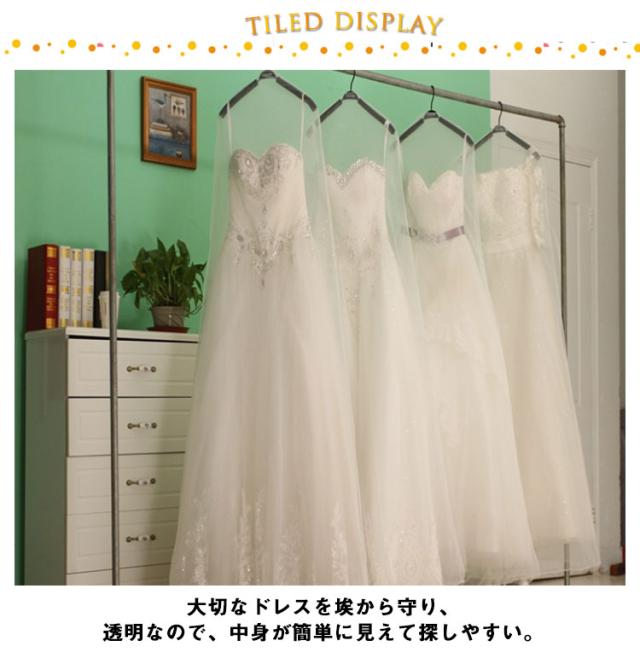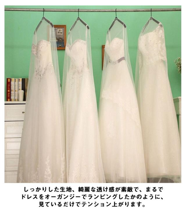| ロングトレーンタイプもすっぽりカバー♪高級感のあるオーガンジードレスカバー。 大切なドレスを埃から守り、透明なので、中身が簡単に見えて探しやすい。 しっかりした生地、綺麗な透け感が素敵で、まるでドレスをオーガンジーでランピングしたかのように、見ているだけでテンション上がります。 幅と長さもたっぷりあり、ボリュームのあるドレスや超ロングドレスなど余裕で収納し、ドレスの保管が美しくできます。 | |