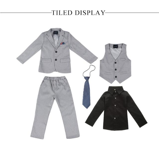 | 【130-180cm】男子フォーマルスーツセット【ジャケット+ベスト+シャツ+パンツ+ネクタイの5点セット】 にこだわったデザインが大人気の男の子スーツ。 これだけあればフォーマルシーンはバッチリ揃います。 重厚感のあるヘリンボーン生地はやや光沢があり、黒の暗い色味が上品に仕上がります。 袖口には3つの飾りボタンがついたおしゃれ仕様。 背当て部分に裏地付きで上品さをオンしています。 ブラックにはホワイトシャツを合わせてよりフォーマルに、グレーにはブラックシャツを合わせて華やかさのあるコーディネートを組みました。 ネクタイやフェイクポケットチーフまでついているので、すぐにワンランク上のフォーマルスタイルが完成します。 卒業式や、結婚式、発表会など、セレモニーから冠婚葬祭まで幅広いシーンで活躍します。 | |