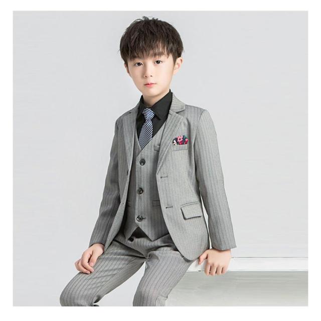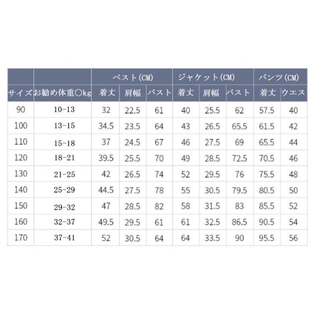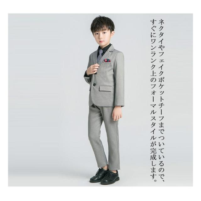 | スタイリッシュな『フォーマルスーツ5点セット ロングパンツ』90cm-170cmサイズあり。 にこだわったデザインが大人気の男の子スーツ。 ジャケット+ベスト+パンツ+シャツ+ネクタイの5点セット これだけあればフォーマルシーンはバッチリ揃います。 重厚感のあるヘリンボーン生地はやや光沢があり、黒の暗い色味が上品に仕上がります。 袖口には3つの飾りボタンがついたおしゃれ仕様。 背当て部分に裏地付きで上品さをオンしています。 ブラックにはホワイトシャツを合わせてよりフォーマルに、グレーにはブラックシャツを合わせて華やかさのあるコーディネートを組みました。 ネクタイやフェイクポケットチーフまでついているので、すぐにワンランク上のフォーマルスタイルが完成します。 卒業式や、結婚式、発表会など、セレモニーから冠婚葬祭まで幅広いシーンで活躍します。 | |