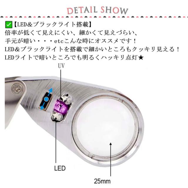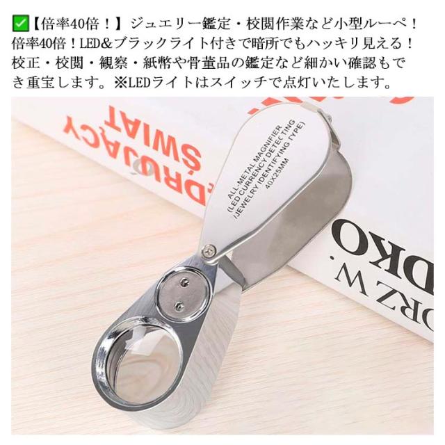 | 【LED&ブラックライト搭載】倍率が低くて見えにくい、細かくて見えづらい、手元が暗い・・・etcこんな時にオススメです!LED&ブラックライトを搭載で細かいところもクッキリ見える!LEDライトで暗いところでも明るくハッキリ点灯★ 【倍率40倍!】ジュエリー鑑定・校閲作業など小型ルーペ!倍率40倍!LED&ブラックライト付きで暗所でもハッキリ見える!校正・校閲・観察・紙幣や骨董品の鑑定など細かい確認もでき重宝します。※LEDライトはスイッチで点灯いたします。 【コンパクトで持ち運び便利】折り畳める・軽量・コンパクトでプレゼントにもオススメです♪小さくて軽いので、胸ポケットに入れて手軽に出せ、持ち運びにも便利です!校正・校閲・精密作業・ジュエリー鑑定など、あらゆるシーンで大活躍! | |