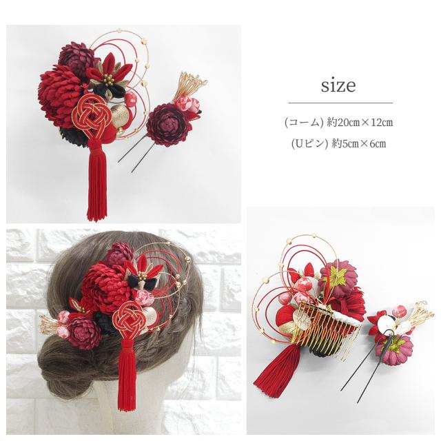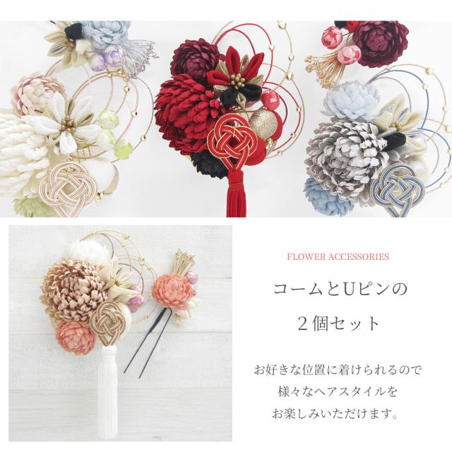 成人式 振袖 髪飾り 2点セット 振袖用 髪飾りセット コーム Uピン ヘアアクセサリー コサージュ 和装 アクセサリー 赤 白 グレー ベージュ 前撮り 七五三 753 浴衣 袴 入学式 卒業式 結婚式 ブライダル 披露宴 和風 洋風 Charmant シャルマン
