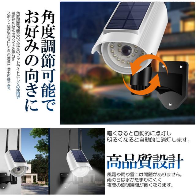 【商品仕様・ダミーカメラ型ライト】 材質:ABS、 ソーラーパネル:1.8W/5.5V(300mA)| 電池容量:2000mah| 防水等級:IP65|本体重さ:316G|防犯カメラと同じ外観を使用しているので,犯罪者に「防犯意識の高い家」という印象を与え大きな脅威となります。発光がセンサーライトとスポットライトの性能を綜合開発し進化した新品です。【省エネ】2000mahのリチウムイオン充電池が内蔵しており、耐久性もっとUPです!完全に充電した後、人感モードでは一晩中使うことができます。太陽光発電な場合、昼間にソーラーエネルギで自動充電し、太陽エネルギーを電気に変換します。電気代は0、廃棄ガスを排出しない自然の力から生まれたクリーンなエネルギーで環境に優しいです。地震や台風などの災害では、電源がoffになっても、照明机能を保ち、避難の防止に貢献します。