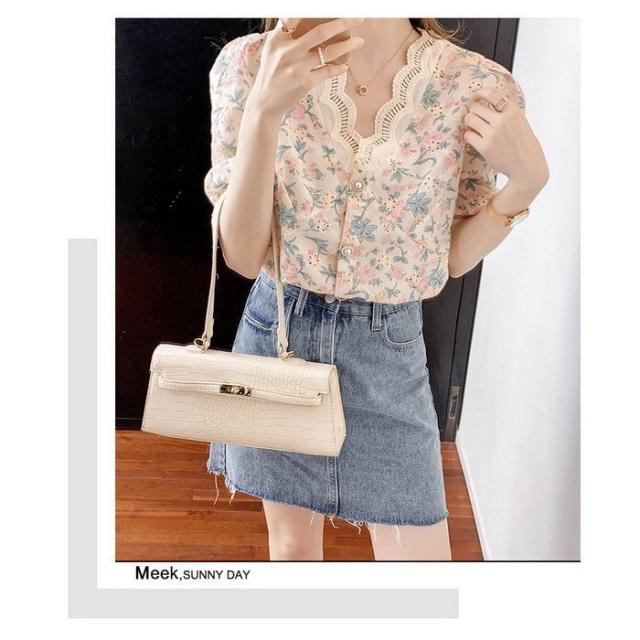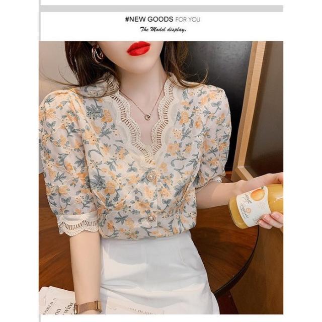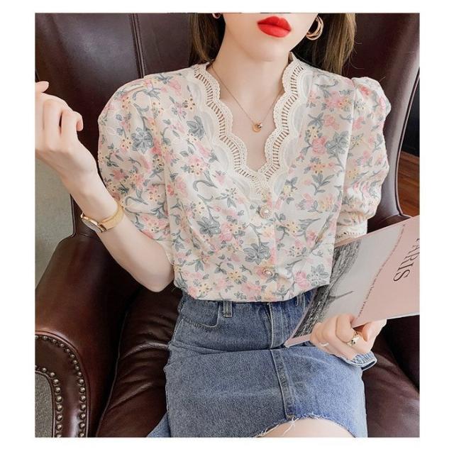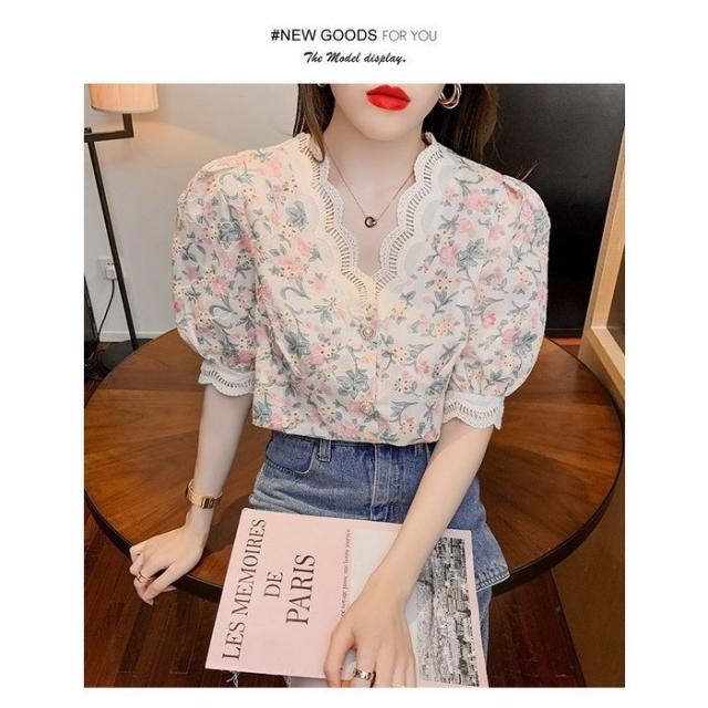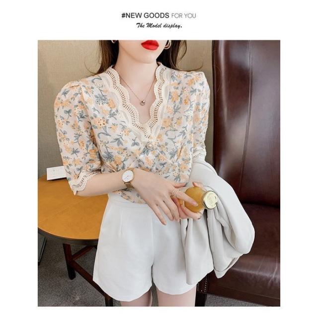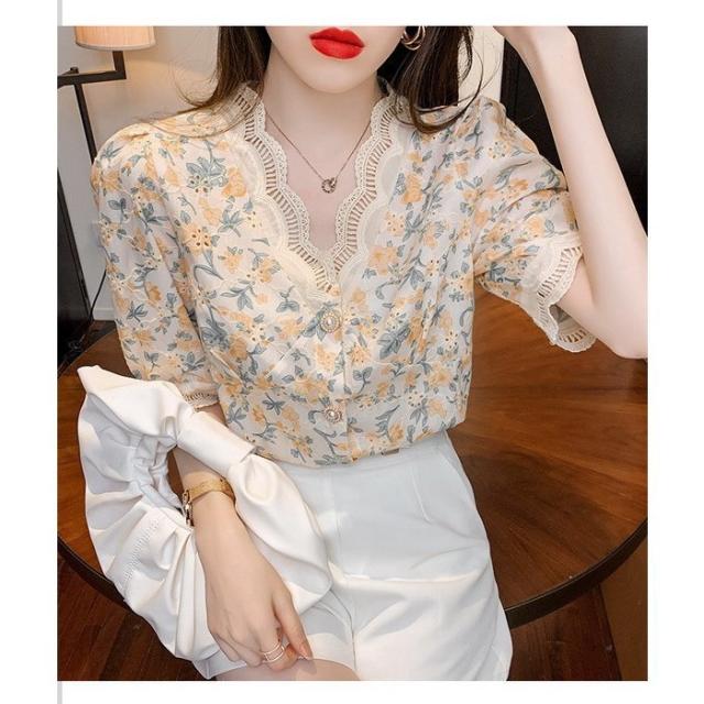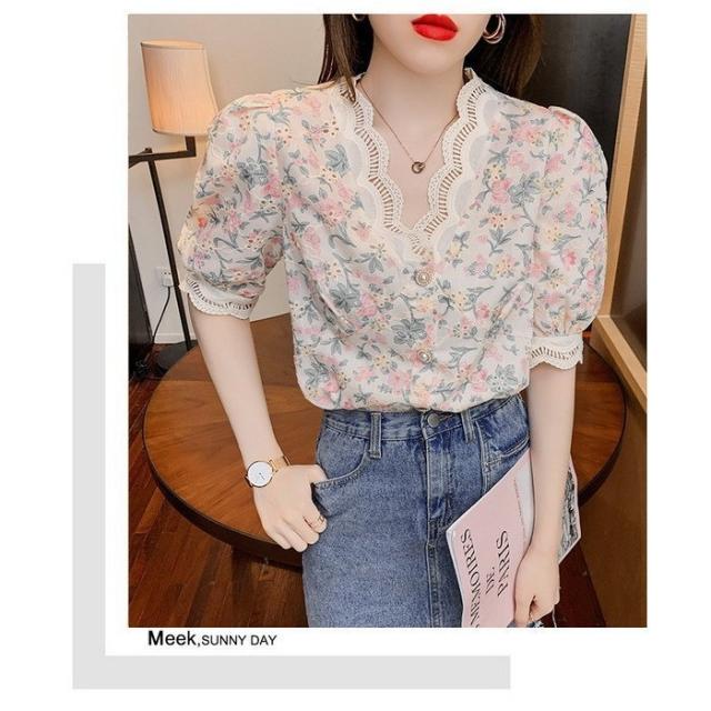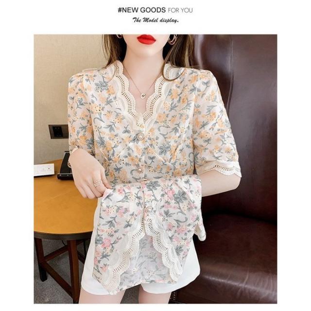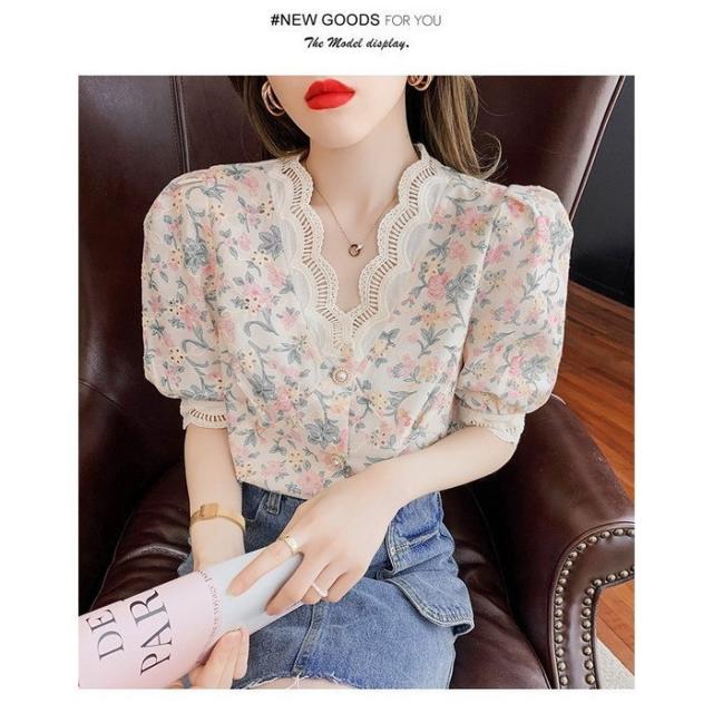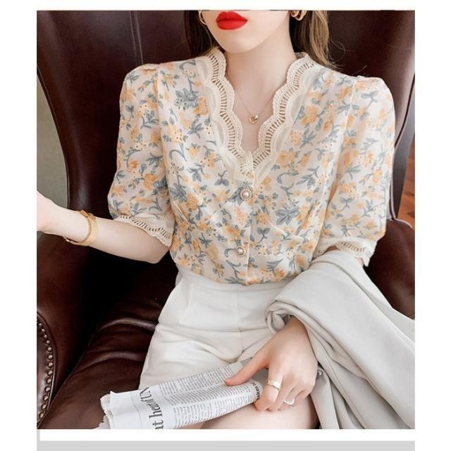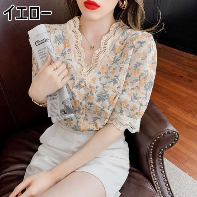 ブラウス レディース 40代 春夏 オシャレブラウス レース花柄 Vネックブラウス パフスリーブブラウス 五分袖 トップス おしゃれ 上品 通勤OL ゆったり 30代