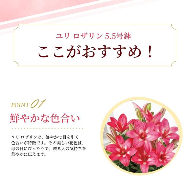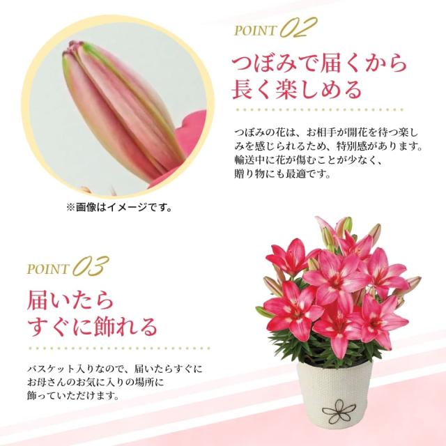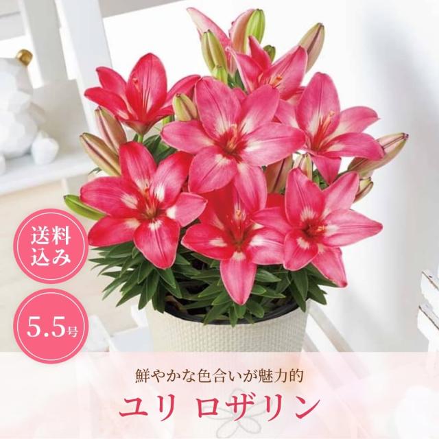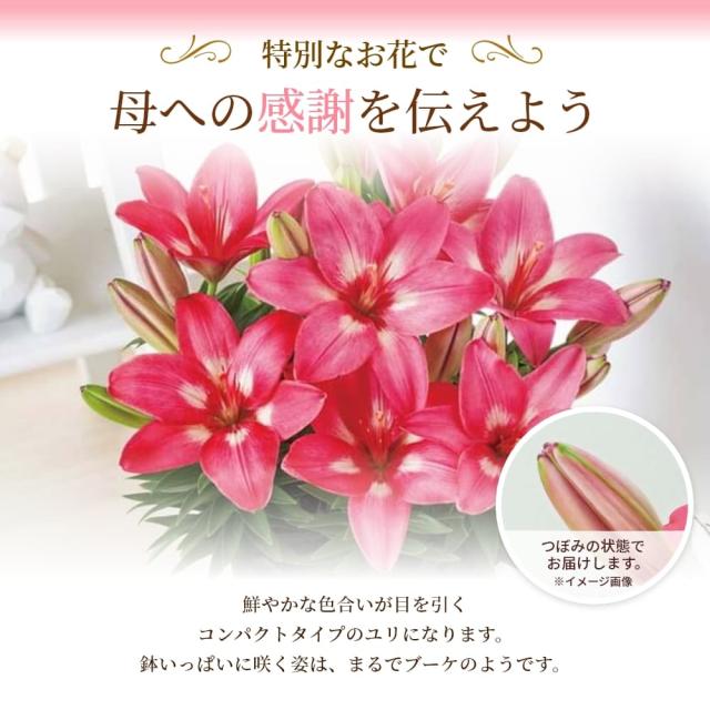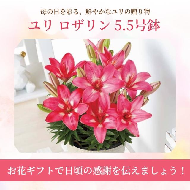 母の日2026 ギフト ユリ鉢植え ロザリン 5.5号鉢 バスケット メッセージカード 鉢植え 常温